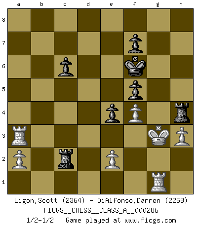 Last move : 1/2-1/2 2025 January 17 18:17:24 [Event "FICGS__CHESS__CLASS_A__000286"] [Site "FICGS"] [Date "2025.01.08"] [Round "1"] [White "Ligon,Scott"] [Black "DiAlfonso,Darren"] [Result "1/2-1/2"] [WhiteElo "2364"] [BlackElo "2258"] 1.d4 Nf6 2.c4 e6 3.Nf3 d5 4.Nc3 Bb4 5.Qb3 c5 6.dxc5 Nc6 7.Bg5 Qa5 8.Bxf6 dxc4 9.Qxc4 gxf6 10.Rc1 Qxc5 11.Qf4 Ke7 12.g3 e5 13.Qe4 Bxc3+ 14.bxc3 Kf8 15.Bg2 Be6 16.Qh4 Kg7 17.Nd2 Qa3 18.O-O h5 19.Bxc6 bxc6 20.Ne4 Rh6 21.f4 f5 22.Ng5 Qc5+ 23.Kh1 e4 24.Nxe6+ Rxe6 25.Rcd1 Rg6 26.Rd7 Qxc3 27.Rfd1 Qf6 28.Qxf6+ Rxf6 29.Kg2 h4 30.Rb1 Rh8 31.Rxa7 hxg3 32.h3 Rfh6 33.Rh1 Rb8 34.Kxg3 Rb2 35.Kf2 Rc2 36.Rg1+ Kf6 37.Ra3 Rh4 38.Kg3 Rh7 39.Kf2 Rh4 40.Kg3 1/2-1/2 Follow this game move after move (download)A chess genius has died; a loss for humanity. (Viktor Kortchnoi, about Bobby Fischer's death) Ich bin der einzige Schachspieler, der sich während der Vorbereitungen zum Turnier verletzt hat. (Woody Allen) Sin errores no puede haber brillantez. (Emanuel Lasker) Karpov est une pièce de musée. (Garry Kasparov) Once you start thinking you have nothing left to learn, you have everything to learn. (Steve Badget)