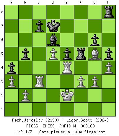 Last move : 1/2-1/2 2025 May 24 19:58:53 [Event "FICGS__CHESS__RAPID_M__000163"] [Site "FICGS"] [Date "2025.01.16"] [Round "1"] [White "Pech,Jaroslav"] [Black "Ligon,Scott"] [Result "1/2-1/2"] [WhiteElo "2190"] [BlackElo "2364"] 1.c4 e5 2.Nc3 Nf6 3.Nf3 Nc6 4.g3 Nd4 5.Bg2 Nxf3+ 6.Bxf3 Bb4 7.Qb3 a5 8.O-O Bc5 9.Rd1 O-O 10.e3 Bb4 11.Nd5 Be7 12.d4 a4 13.Qc2 Nxd5 14.cxd5 d6 15.a3 Bd7 16.Bg2 f5 17.dxe5 dxe5 18.e4 Bd6 19.exf5 Bxf5 20.Be4 Qd7 21.Be3 Ra5 22.Rd2 Bxe4 23.Qxe4 Qf5 24.Qxf5 Rxf5 25.Rc1 Kf8 26.Rc4 Ke7 27.Rg4 g6 28.Kf1 Kd7 29.Ke2 Rh5 30.h4 Rf5 31.Re4 h5 32.Rc2 Ra6 33.Rc3 b5 34.Rd3 Be7 35.f3 Bd6 36.Bd2 Ra8 37.Rc3 Raf8 38.Bg5 Rh8 39.Be3 Rhf8 40.Bg5 Rh8 1/2-1/2 Follow this game move after move (download)Of Chess it has been said that life is not long enough for it, but that is the fault of life, not Chess. (William Ewart Napier) Ich verachte die Medien. (Robert James Fischer) Morphy probablemente fue el genio más grande de todos. (Bobby Fischer) Vous savez, camarade Pachman, je n'éprouve pas de plaisir à être ministre, je jouerais plutôt aux échecs comme vous, ou alors ferais une révolution au Venezuela. (Che Guevara à Ludek Pachman, 'Checkmate in Prague', 1975) God, you are such an idiot. - Actually, I thought I was more of a jerk. (Gregory House to Stacy Warner, House M.D.)