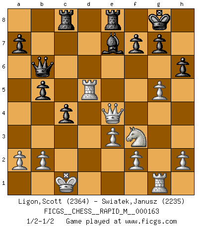 Last move : 1/2-1/2 2025 February 15 0:45:4 [Event "FICGS__CHESS__RAPID_M__000163"] [Site "FICGS"] [Date "2025.01.16"] [Round "1"] [White "Ligon,Scott"] [Black "Swiatek,Janusz"] [Result "1/2-1/2"] [WhiteElo "2364"] [BlackElo "2235"] 1.d4 Nf6 2.c4 e6 3.Nf3 d5 4.Nc3 Nbd7 5.Bg5 h6 6.Bxf6 Nxf6 7.e3 c6 8.Qc2 Be7 9.O-O-O dxc4 10.Bxc4 b5 11.Bd3 Bb7 12.Ne4 Nxe4 13.Bxe4 Rc8 14.g4 Qb6 15.Rhg1 c5 16.d5 exd5 17.Bxd5 Bxd5 18.Rxd5 O-O 19.g5 c4 20.Qe4 Rfe8 1/2-1/2 Follow this game move after move (download)Who is your opponent tonight, tonight I am playing against the Black pieces. (Akiba Rubinstein) Im Internet Chess Club betrug mein Rating vorübergehend 3350 ELO-Punkte. (Sergej Karjakin) El Peón aislado arroja penumbra sobre todo el tablero. (Aaron Nimzovich) Avec des compensations pour le matériel en plus... (Anonyme) A person who never made a mistake never tried anything new. (Albert Einstein)