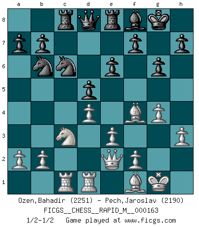 Last move : 1/2-1/2 2025 April 24 12:17:25 [Event "FICGS__CHESS__RAPID_M__000163"] [Site "FICGS"] [Date "2025.01.16"] [Round "1"] [White "Ozen,Bahadir"] [Black "Pech,Jaroslav"] [Result "1/2-1/2"] [WhiteElo "2251"] [BlackElo "2190"] 1.d4 Nf6 2.Nf3 g6 3.g3 d5 4.Bg2 Bg7 5.c4 c6 6.Qa4 O-O 7.O-O Nfd7 8.cxd5 cxd5 9.Nc3 Nb6 10.Qd1 Nc6 11.h3 Bf5 12.Bf4 Rc8 13.e3 e6 14.g4 Be4 15.Qe2 Re8 16.Rac1 Bxf3 17.Qxf3 Nc4 18.Qe2 Bf8 19.Rfd1 Nb6 20.Bf1 1/2-1/2 Follow this game move after move (download)The passed Pawn is a criminal, who should be kept under lock and key. Mild measures, such as police surveillance, are not sufficient. (Aaron Nimzovich) Rubinstein ist ein Turmendspiel, welches die Götter vor tausenden von Jahren begannen. (Savielly Grigorievitsch Tartakower) El Ajedrez es el juego mas altamente simbólico, pero las agresiones estan por lo tanto aún mas francamente representadas en la partida. Tal vez comenzo como un juego de guerra; Algo como la representación de una batalla en miniatura entre las fuerzas de dos reinos. (Karl Meninger) Le jeu d'échecs est comme rejeté hors du temps. (Antoine de Saint-Exupéry) All war is based on deception. (Sun Tzu)