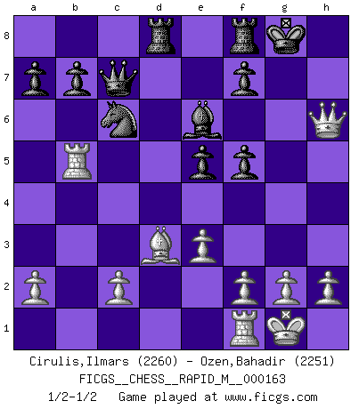 Last move : 1/2-1/2 2025 February 8 14:27:7 [Event "FICGS__CHESS__RAPID_M__000163"] [Site "FICGS"] [Date "2025.01.16"] [Round "1"] [White "Cirulis,Ilmars"] [Black "Ozen,Bahadir"] [Result "1/2-1/2"] [WhiteElo "2260"] [BlackElo "2251"] 1.d4 Nf6 2.Nc3 d5 3.Bf4 e6 4.Nf3 Bb4 5.Qd3 Ne4 6.Nd2 Nxc3 7.bxc3 Bd6 8.Bxd6 cxd6 9.e3 O-O 10.c4 dxc4 11.Qxc4 e5 12.dxe5 dxe5 13.Bd3 Qa5 14.Rb1 Nc6 15.Rb5 Qc7 16.O-O Be6 17.Qh4 h6 18.Ne4 Rad8 19.Nf6+ gxf6 20.Qxh6 f5 1/2-1/2 Follow this game move after move (download)Every Chess master was once a beginner. (Chernev) Ja, jede Frau in Holland liebt mich bestimmt, und alle Männer hassen mich. (Loek van Wely) El Ajedrez es despiadado: debes de estar preparado para matar gente. (Nigel Short) On peut tirer plus d'utilité d'une partie perdue que de 100 parties gagnées. (Capablanca) Computers have lots of memory but no imagination. (Anonymous)
