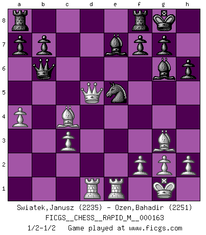 Last move : 1/2-1/2 2025 March 4 22:6:30 [Event "FICGS__CHESS__RAPID_M__000163"] [Site "FICGS"] [Date "2025.01.16"] [Round "1"] [White "Swiatek,Janusz"] [Black "Ozen,Bahadir"] [Result "1/2-1/2"] [WhiteElo "2235"] [BlackElo "2251"] 1.e4 e5 2.Nf3 Nf6 3.Nxe5 d6 4.Nf3 Nxe4 5.d4 d5 6.Bd3 Bd6 7.O-O O-O 8.c4 c6 9.Nc3 Nxc3 10.bxc3 dxc4 11.Bxc4 Bf5 12.Bg5 Qa5 13.d5 Qc7 14.Re1 h6 15.Bh4 Bg6 16.a4 cxd5 17.Qxd5 Nc6 18.Rad1 Be7 19.Bg3 Qb6 20.Ne5 Nxe5 1/2-1/2 Follow this game move after move (download)The stomach is an essential part of the Chess master. (Bent Larsen) Im Wettkampf zwischen starken Meistern kommen Fehler sehr selten vor, deshalb ist es mit bloßem Warten nicht getan. (José Raúl Capablanca) Tu sabes, camarada Pachman, no disfruto el ser un Ministro, preferería jugar al Ajedrez como tu. (Che Guevara) Les écrivains ont utilisé les échecs pour analyser les côtés extrêmes de la nature humaine. Dans ce cadre, les échecs offrent un champ d'expérimentation idéal. Mais on pourrait faire la même chose avec la peinture. Et là, en vous référant à Van Gogh, vous ne tirerez pas de conclusion définitive sur les peintres. (Gary Kasparov) It is not enough to be a good player... you must also play well. (Siegbert Tarrasch)