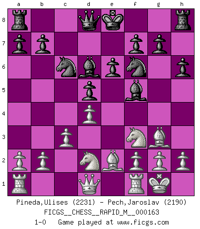Last move : 1-0 2025 March 20 17:35:44 [Event "FICGS__CHESS__RAPID_M__000163"] [Site "FICGS"] [Date "2025.01.16"] [Round "1"] [White "Pineda,Ulises"] [Black "Pech,Jaroslav"] [Result "1-0"] [WhiteElo "2231"] [BlackElo "2190"] 1.d4 d5 2.Bf4 c5 3.e3 Nf6 4.Nf3 Nc6 5.Be2 cxd4 6.exd4 Bf5 7.c3 e6 8.Nbd2 Bd6 9.Bg3 h6 10.O-O 1-0 Follow this game move after move (download)You must take your opponent into a deep dark forest where 2+2=5, and the path leading out is only wide enough for one. (Mikhail Tal) Wer wird heute Abend ihr Gegner sein? -- Heute Abend spiele ich gegen die schwarzen Steine. (Akiba Rubinstein) En el Ajedrez, tal como en la vida, las bendiciones de hoy pueden ser el veneno del mañana. (Assaic) La vie et les Echecs sont tous les deux une lutte constante. (Lasker) Looking at the proliferation of personal web pages on the Net, it looks like very soon everyone on Earth will have 15 megabytes of fame. (M.G. Sriram)