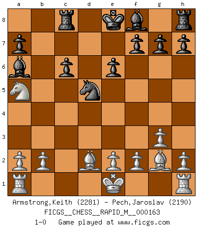 Last move : 1-0 2025 March 20 17:36:22 [Event "FICGS__CHESS__RAPID_M__000163"] [Site "FICGS"] [Date "2025.01.16"] [Round "1"] [White "Armstrong,Keith"] [Black "Pech,Jaroslav"] [Result "1-0"] [WhiteElo "2281"] [BlackElo "2190"] 1.Nf3 Nf6 2.c4 c5 3.Nc3 Nc6 4.g3 d5 5.d4 cxd4 6.Nxd4 dxc4 7.Nxc6 Qxd1+ 8.Nxd1 bxc6 9.Bg2 Nd5 10.Ne3 e6 11.Nxc4 Ba6 12.Na5 Rc8 13.Bd2 1-0 Follow this game move after move (download)Do you realize Fischer almost never has any bad pieces? He exchanges them, and the bad pieces remain with his opponents. (Yuri Balashov) Ich erzeugte keinen Neid, da mich die Schachspieler als Musiker und die Musiker als Schachspieler betrachteten. (Mark Taimanov) Cualquier cambio de material en una posición debe venir por medio de un mate, una captura o promoción de Peón. (Purdy) Les Echecs ont trois composantes : le temps, l'espace et le matériel en dernier. (Mikhail Tal) If you work for a living, why do you kill yourself working ? (Tuco to a chicken in The Good, The Bad and The Ugly)