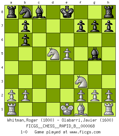 Last move : 1-0 2007 November 11 7:4:5 [Event "FICGS__CHESS__RAPID_B__000068"] [Site "FICGS"] [Date "2007.09.26"] [Round "1"] [White "Whitman,Roger"] [Black "Olabarri,Javier"] [Result "1-0"] [WhiteElo "1800"] [BlackElo "1600"] 1.c4 Nf6 2.Nc3 e6 3.e4 d5 4.e5 Nfd7 5.d4 c5 6.cxd5 exd5 7.Nf3 Nb6 8.Bg5 Be7 9.dxc5 Bxg5 10.cxb6 axb6 11.Qxd5 Qxd5 12.Nxd5 1-0 This chess game has been lost on time (started : 2007.09.26 13:34:21) English : Mikenas-Carls, Flohr variation Player White won this chess game. Follow this game move after move (download)Castle early and often. (Rob Sillars) Der Schachmeister von Heute braucht Courage, einen Killerinstinkt, Ausdauer und Arroganz. (Larry Evans) Las ideas audaces son como las piezas del Ajedrez que avanzan hacia adelante. Ellas pueden ser vencidas, pero también pueden iniciar una partida victoriosa. (Goethe) RxDa4 pat (...) Every vice is only an exaggeration of a necessary and virtuous function. (Ralph Waldo Emerson, Journals 1936)