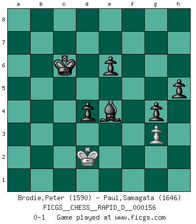 Last move : 0-1 2025 April 9 22:22:59 [Event "FICGS__CHESS__RAPID_D__000156"] [Site "FICGS"] [Date "2025.01.18"] [Round "1"] [White "Brodie,Peter"] [Black "Paul,Samagata"] [Result "0-1"] [WhiteElo "1590"] [BlackElo "1646"] 1.c4 c5 2.Nc3 Nc6 3.Nf3 d6 4.d4 cxd4 5.Nxd4 Nxd4 6.Qxd4 Nf6 7.e4 e6 8.Qd1 Be7 9.Be2 h6 10.O-O O-O 11.Be3 Bd7 12.Qd2 a6 13.a3 Bc6 14.f3 Qc7 15.Bd1 Nd7 16.Be2 Rad8 17.Qc2 Nc5 18.Bxc5 dxc5 19.Rad1 Bf6 20.g3 Rb8 21.a4 Bd4+ 22.Kg2 f5 23.e5 Qxe5 24.Bd3 g5 25.Rde1 Qd6 26.Qe2 g4 27.Be4 fxe4 28.fxe4 h5 29.Qd3 Qe5 30.Rxf8+ Rxf8 31.Rf1 Rxf1 32.Kxf1 Qf6+ 33.Ke2 Qf2+ 34.Kd1 Qxh2 35.Ne2 Qh1+ 36.Kd2 Qxe4 37.Qxe4 Bxe4 38.Nxd4 cxd4 39.b4 Kf7 40.c5 Ke7 41.b5 axb5 42.axb5 Kd7 43.c6+ bxc6 44.bxc6+ Kxc6 0-1 Follow this game move after move (download)Without error there can be no brilliancy. (Emanuel Lasker) Ohne Fehler kann es keine Brillanz geben. (Emanuel Lasker) Bobby es el jugador de Ajedrez mas fino que este país jamás haya producido. Su memoria para las movidas, su brillantez en soñar combinaciones y su feróz determinación por la victoria son algo extraño. (John Collins) Si le désir cupide (et stupide) de gagner est une inépuisable source de souffrance, une combinaison brillante sur l'échiquier est une découverte : le coquelicot qui s'épanouit lorsque apparaît la Voie Lactée. (Arrabal) Gambling is the son of avarice and the father of despair. (French proverb)