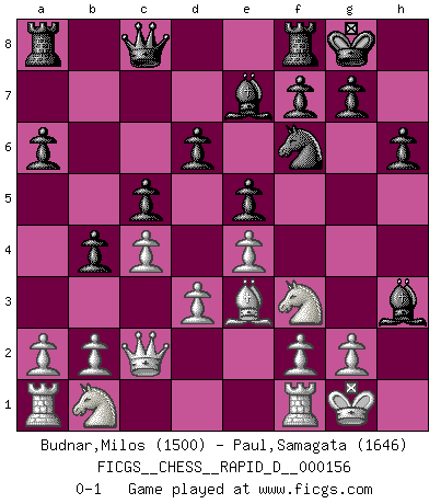 Last move : 0-1 2025 January 24 7:24:5 [Event "FICGS__CHESS__RAPID_D__000156"] [Site "FICGS"] [Date "2025.01.18"] [Round "1"] [White "Budnar,Milos"] [Black "Paul,Samagata"] [Result "0-1"] [WhiteElo "1500"] [BlackElo "1646"] 1.e4 e5 2.Nf3 Nc6 3.Bb5 d6 4.h3 Nf6 5.d3 h6 6.O-O Be7 7.c3 Bd7 8.Na3 a6 9.Bc4 O-O 10.Qb3 Na5 11.Qc2 Nxc4 12.Nxc4 c5 13.Be3 b5 14.Na3 Qc8 15.c4 b4 16.Nb1 Bxh3 0-1 Follow this game move after move (download)Morphy was probably the greatest genius of them all. (Bobby Fischer) Mit sehr nachdenklichem Gesicht schreitet Bobby durch den Turniersaal. Was ist passiert?, fragt Lombardy. Ich stehe schlecht, antwortet Fischer. Lombardy: Dann biete doch einfach Remis an. Fischer: So schlecht stehe ich nun auch wieder nicht! (Robert James Fischer) Con el tiempo, empecé a progresar en partidas decisivas. Tal vez porque me di cuenta de una simple verdad: no solo estaba yo nervioso sino también mi oponente. (Mikhail Tal) Avec des compensations pour le matériel en plus... (Anonyme) Players are not good because they find tactics, it is about the way to find the positions in which those tactics are hidden. (Luc-Olivier Leclerc)