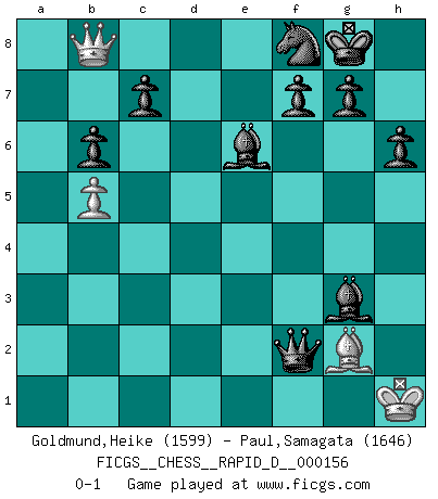 Last move : 0-1 2025 April 6 11:55:15 [Event "FICGS__CHESS__RAPID_D__000156"] [Site "FICGS"] [Date "2025.01.18"] [Round "1"] [White "Goldmund,Heike"] [Black "Paul,Samagata"] [Result "0-1"] [WhiteElo "1599"] [BlackElo "1646"] 1.b4 e5 2.Bb2 d6 3.e3 Be6 4.Nf3 h6 5.Be2 Nf6 6.c4 Nc6 7.a3 a6 8.O-O Be7 9.d3 O-O 10.Nbd2 Qd7 11.Qc2 Bg4 12.h3 Bf5 13.Rfe1 Rfe8 14.Bf1 Nh7 15.b5 axb5 16.cxb5 Nd8 17.a4 Ne6 18.Rac1 Rec8 19.Nc4 Nc5 20.Nh4 Be6 21.Nf3 Rxa4 22.Na3 Rca8 23.Ra1 b6 24.d4 exd4 25.Nxd4 Bd5 26.Ra2 Bxa2 27.g3 Rxa3 28.Bxa3 Rxa3 29.Ra1 Nb3 30.Nxb3 Bxb3 31.Qb2 Rxa1 32.Qxa1 Bd5 33.Qd4 Be6 34.Qe4 d5 35.Qa4 Bxh3 36.Bd3 Bf5 37.Be2 Bc5 38.Bf3 d4 39.Bc6 Qd6 40.exd4 Qxd4 41.Qa8+ Nf8 42.Qe8 Be6 43.Qb8 Qxf2+ 44.Kh1 Bd6 45.Bg2 Bxg3 0-1 Follow this game move after move (download)What is the object of playing a gambit opening?... To acquire a reputation of being a dashing player at the cost of losing a game. (Siegbert Tarrasch) Irgendwie scheint mir sonntags früh um 9 Uhr der Killerinstinkt verloren gegangen zu sein. (Alexej Shirov) Prefiero perder una partida realmente buena, que ganar una mala. (David Levy) Vous n'êtes pas toujours obligé de jouer le meilleur coup. Un coup doit être actif, entreprenant, correct et beau ! (David Bronstein) The right perception of any matter and a misunderstanding of the same matter do not wholly exclude each other. (Kafka's the trial)