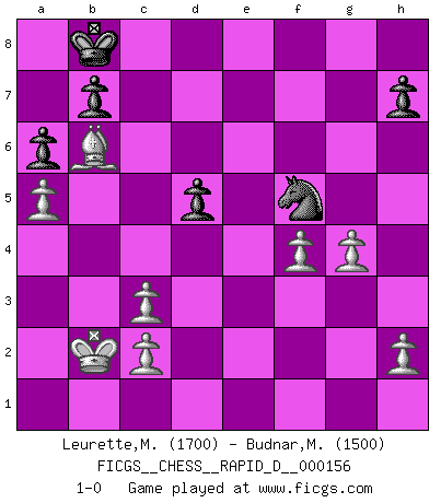 Last move : 1-0 2025 January 27 7:58:40 [Event "FICGS__CHESS__RAPID_D__000156"] [Site "FICGS"] [Date "2025.01.18"] [Round "1"] [White "Leurette,Marc-Antoine"] [Black "Budnar,Milos"] [Result "1-0"] [WhiteElo "1700"] [BlackElo "1500"] 1.e4 e5 2.Nf3 d6 3.d4 Bg4 4.dxe5 Bxf3 5.gxf3 a6 6.exd6 Qxd6 7.Nc3 Qxd1 8.Nxd1 Nc6 9.Nc3 O-O-O 10.Be3 Bb4 11.Rg1 g6 12.Bd3 f6 13.Bd2 Nd4 14.Rg3 f5 15.a3 Ba5 16.O-O-O c6 17.exf5 gxf5 18.f4 Nf6 19.Be3 Bxc3 20.bxc3 Nb5 21.Bxf5+ Kb8 22.Rxd8+ Rxd8 23.Bb6 Rh8 24.Kb2 Rg8 25.a4 Rxg3 26.fxg3 Nd6 27.Be6 Nd5 28.Bxd5 cxd5 29.a5 Nf5 30.g4 1-0 Follow this game move after move (download)For me, Chess is life and every game is like a new life. Every Chess player gets to live many lives in one lifetime. (Eduard Gufeld) Mein Name ist Rustam Kamsky. Sie haben meinen Sohn belästigt. Bereiten Sie sich aufs Sterben vor. (Rustam Kamsky) Me gusta decir que Bobby Fischer fue el mejor jugador que jamás haya existido. Pero lo que hizo de Fischer un genio, fue su habilidad de mezclar una frescura y pragmatismo Americano con ideas Rusas acerca de la estrategia. (Bruce Pandolfini) Aux échecs, les retours au sommet sont rares : les dommages psychologiques consécutifs à une défaite sont trop sévères. (Daily Telegraph) Live, lose, and learn, by observing your opponent how to win. (Amber Steenbock)