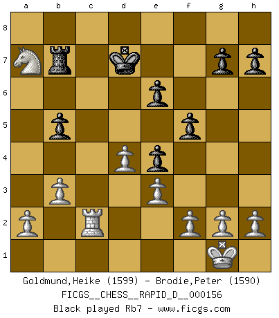 Last move : 0-1 2025 June 21 5:6:46 [Event "FICGS__CHESS__RAPID_D__000156"] [Site "FICGS"] [Date "2025.01.18"] [Round "1"] [White "Goldmund,Heike"] [Black "Brodie,Peter"] [Result "0-1"] [WhiteElo "1599"] [BlackElo "1590"] 1.Nf3 Nf6 2.d4 d5 3.Bf4 Bf5 4.e3 e6 5.Bd3 Bxd3 6.Qxd3 Bd6 7.Bxd6 cxd6 8.Nbd2 O-O 9.O-O Nc6 10.b3 Nb4 11.Qc3 Ne4 12.Qxb4 Qb6 13.Qxb6 axb6 14.Nxe4 dxe4 15.Nd2 d5 16.c4 dxc4 17.Nxc4 b5 18.Ne5 Rad8 19.Rac1 f6 20.Ng4 f5 21.Ne5 Ra8 22.Rc2 Rac8 23.Rfc1 Rxc2 24.Rxc2 Ra8 25.Nd7 Kf7 26.Nc5 b6 27.Nd7 Ke7 28.Nxb6 Rb8 29.Nc8+ Kd7 30.Na7 Rb7 31.Nxb5 Rxb5 32.Kf1 Kd6 33.Ke2 g5 34.Rc4 h5 35.b4 Kd5 36.Rc5+ Rxc5 37.bxc5 Kc6 38.Kd2 Kb5 39.Kc3 Kc6 40.a4 e5 41.a5 Kb5 42.a6 Kxa6 43.Kb4 Kb7 44.Kb5 exd4 45.exd4 Kc7 46.d5 f4 47.d6+ Kd7 48.Kc4 Kc6 49.Kd4 e3 50.fxe3 fxe3 51.Kxe3 Kd7 0-1 This chess game has been lost on time (started : 2025.01.18 14:13:39) Follow this game move after move (download)Why must I lose to this idiot ? (Aron Nimzovich) Man wirke der falschen Auffassung entgegen, als ob jeder Zug Unmittelbares zu leisten habe; auch Werte- und Ruhezüge haben ihre Existenzberechtigung. (Aaron Nimzowitsch) La vida es como un juego de Ajedrez, cambiando con cada movimiento. (Proverbio Chino) L'ordinateur a tué l'originalité. Il n'y a plus guère d'aventures sur l'échiquier. (Jacob Murray) Thus, what is of supreme importance in war is to attack the enemy's strategy. (Sun Tzu)