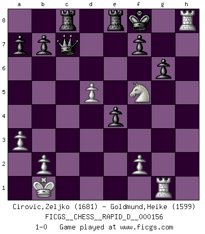 Last move : 1-0 2025 April 20 8:35:14 [Event "FICGS__CHESS__RAPID_D__000156"] [Site "FICGS"] [Date "2025.01.18"] [Round "1"] [White "Cirovic,Zeljko"] [Black "Goldmund,Heike"] [Result "1-0"] [WhiteElo "1681"] [BlackElo "1599"] 1.e4 d5 2.exd5 Qxd5 3.Nf3 Nf6 4.d4 Bg4 5.Be2 e6 6.c4 Qd8 7.h3 Bf5 8.Nc3 Bd6 9.Be3 Bb4 10.a3 Bd6 11.Bd3 Bxd3 12.Qxd3 O-O 13.O-O-O c6 14.d5 cxd5 15.cxd5 e5 16.Bg5 Nbd7 17.Kb1 h6 18.Bxf6 Nxf6 19.Ne4 Nxe4 20.Qxe4 Qb6 21.Qe3 Qc7 22.g4 Rfe8 23.h4 e4 24.Nd4 Bf4 25.Qb3 Rac8 26.g5 hxg5 27.hxg5 Bxg5 28.Rdg1 Bf6 29.Qh3 Kf8 30.Nf5 g6 31.Qh6+ Kg8 32.Qh7+ Kf8 33.Qh8+ Bxh8 34.Rxh8+ 1-0 Follow this game move after move (download)Though most people love to look at the games of the great attacking masters, some of the most successful players in history have been the quiet positional players. They slowly grind you down by taking away your space, tying up your pieces, and leaving you with virtually nothing to do ! (Yasser Seirawan) Ein Buch ist ein Spiegel; wenn ein Affe hineinsieht, so kann kein Apostel heraus gucken. (Georg Christoph Lichtenberg) Un Peón pasado aumenta su poder a medida de que el número de piezas en el tablero disminuye. (Capablanca) Comme les marins qui ont mille raisons différentes d'aller en mer, les joueurs d'échecs en ont tout autant avant de s'installer devant une table et jouer... (Vincent Bertignac, philosophe) You know what they say : You lie down with the Devil, you wake up in Hell. (Horatio Caine, C.S.I. Miami)