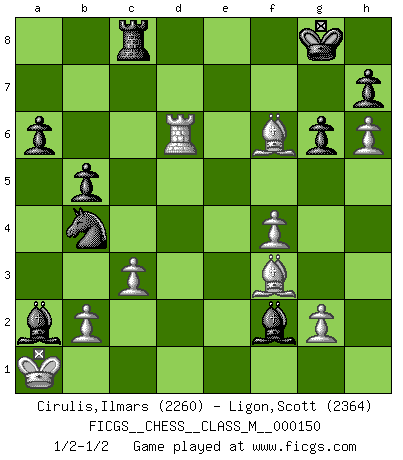Last move : 1/2-1/2 2025 February 11 19:1:29 [Event "FICGS__CHESS__CLASS_M__000150"] [Site "FICGS"] [Date "2025.01.21"] [Round "1"] [White "Cirulis,Ilmars"] [Black "Ligon,Scott"] [Result "1/2-1/2"] [WhiteElo "2260"] [BlackElo "2364"] 1.d4 Nf6 2.Nc3 d5 3.Bf4 e6 4.Nf3 Bb4 5.Qd3 c5 6.dxc5 Ne4 7.Nd2 Nxd2 8.Bxd2 Bxc5 9.Qg3 O-O 10.O-O-O f5 11.h4 Nc6 12.h5 d4 13.Nb1 Qe7 14.h6 g6 15.e3 e5 16.exd4 Bxd4 17.Bg5 Qf7 18.f4 Be6 19.Qa3 Rac8 20.Nc3 Be3+ 21.Kb1 a6 22.Be2 Rfe8 23.Rhe1 b5 24.Qd6 Bf2 25.Bf3 e4 26.Rxe4 fxe4 27.Nxe4 Bxa2+ 28.Ka1 Re6 29.Nf6+ Qxf6 30.Bxf6 Rxd6 31.Rxd6 Nb4 32.c3 1/2-1/2 Follow this game move after move (download)My style is somewhere between that of Tal and Petrosian. (Reshevsky) Es ist besser die Steine des Gegners zu opfern. (Savielly Grigorievitsch Tartakower) El Ajedrez es un expediente tonto que hace creer a la gente inactiva que hacen una cosa muy astuta cuando solamente estan perdiendo su tiempo. (George Bernard Shaw) Karpov est une pièce de musée. (Garry Kasparov) This is where the fun begins. (Anakin Skywalker in Star Wars ep.3)