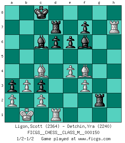 Last move : 1/2-1/2 2025 January 29 20:41:5 [Event "FICGS__CHESS__CLASS_M__000150"] [Site "FICGS"] [Date "2025.01.21"] [Round "1"] [White "Ligon,Scott"] [Black "Detchin,Yra"] [Result "1/2-1/2"] [WhiteElo "2364"] [BlackElo "2240"] 1.e4 c5 2.Nf3 d6 3.d4 cxd4 4.Nxd4 Nf6 5.Nc3 Nc6 6.Bg5 e6 7.Qd2 a6 8.O-O-O Bd7 9.Kb1 Nxd4 10.Qxd4 Be7 11.f3 Qc7 12.Qd2 b5 13.g4 h5 14.gxh5 b4 15.Ne2 Rxh5 16.Be3 a5 17.h4 a4 18.Ng3 Rh8 19.h5 a3 20.h6 gxh6 21.Nh5 Rg8 22.b3 Nxh5 23.Rxh5 Qc3 24.Qxc3 bxc3 25.Rxh6 Bc6 26.Rh5 Rg3 27.Be2 Bf6 28.Bf4 Rg2 29.Bc4 O-O-O 30.Rh7 Rd7 1/2-1/2 Follow this game move after move (download)War is the child of passion, passion is the child of narcissism and narcissism is the child. (...) Another game ? (Thibault de Vassal) Man kann eine Schachpartie nur gewinnen, wenn das Gleichgewicht gestört ist. In einer Stellung mit ungestörtem Gleichgewicht ist auch das größte Genie hilflos - in der Stellung steckt dann eben kein genialer Einfall. (Wilhelm Steinitz) A la fecha, Fischer esta simplemente un nivel arriba de todos los mejores jugadores de Ajedrez del mundo. (John Jacobs) Avec des compensations pour le matériel en plus... (Anonyme) He who is a good ruler must first have been ruled. (Aristotle)