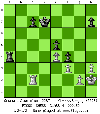 Last move : 1/2-1/2 2025 February 10 22:4:44 [Event "FICGS__CHESS__CLASS_M__000150"] [Site "FICGS"] [Date "2025.01.21"] [Round "1"] [White "Gounant,Stanislas"] [Black "Kireev,Sergey"] [Result "1/2-1/2"] [WhiteElo "2287"] [BlackElo "2273"] 1.b3 e5 2.Bb2 Nc6 3.e3 Nf6 4.Bb5 Qe7 5.Ne2 a6 6.Bxc6 dxc6 7.d3 Bg4 8.h3 Bh5 9.Ba3 Qe6 10.f3 O-O-O 11.e4 Nd7 12.Bxf8 Nxf8 13.a4 b6 14.Qd2 f6 15.b4 Qe7 16.Qc3 Nd7 17.O-O c5 18.Ng3 cxb4 19.Qc4 b5 20.axb5 Bf7 21.Nf5 Qf8 22.Qc6 Nb8 23.Qa8 g6 24.bxa6 Kd7 25.a7 Nc6 26.Qb7 gxf5 27.Qb5 Qd6 28.Ra6 Ra8 29.Kh2 Ke7 30.Qxc6 Qxc6 31.Rxc6 Rxa7 32.Nd2 f4 33.Nb3 Rd8 34.Rb1 Rd6 35.Rc5 Kd7 36.Na5 Rda6 37.Nc4 Ra4 38.d4 Bxc4 39.Rxc4 b3 40.Rxa4 bxc2 41.Rc1 Rxa4 42.dxe5 fxe5 43.Rxc2 1/2-1/2 Follow this game move after move (download)A big shock; the best chess player in history has passed away. (Lajos Portisch, about Bobby Fischer's death) Ich moechte nie einem Club beitreten, der Leute wie mich als Mitglieder aufnimmt. (Woody Allen) Una clavada es mas poderosa que una espada. (Fred Reinfeld) Toutes les manuvres exécutées sur une colonne ouverte ont pour but ultime l'intrusion définitive sur la septième ou la huitième rangée, en plein cur de la position ennemie. (Aaron Nimzovitch) Rules and bones are meant to be broken. (Anonymous)