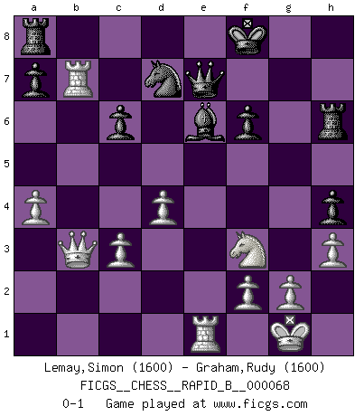 Last move : 0-1 2007 November 9 2:51:40 [Event "FICGS__CHESS__RAPID_B__000068"] [Site "FICGS"] [Date "2007.09.26"] [Round "1"] [White "Lemay,Simon"] [Black "Graham,Rudy"] [Result "0-1"] [WhiteElo "1600"] [BlackElo "1600"] 1.d4 d5 2.c4 dxc4 3.Nc3 c6 4.a4 h5 5.Nf3 h4 6.e4 Bg4 7.Bxc4 e6 8.h3 Bh5 9.Be3 Bb4 10.O-O Bxc3 11.bxc3 Nd7 12.Rb1 Qe7 13.Rxb7 f6 14.Qb3 Bf7 15.e5 Nh6 16.Bxh6 Rxh6 17.exf6 gxf6 18.Re1 Kf8 19.Bxe6 Bxe6 0-1 Queen's gambit accepted Kingside Castling by player White (move 10) Player Black won this chess game. Follow this game move after move (download)Personally, I rather look forward to a computer program winning the world Chess Championship. Humanity needs a lesson in humility. (Richard Dawkings) Unter Putin wird alles Geld aus Russland wie von einem Staubsauger nach Moskau umgeleitet, das ist wie ein schwarzes Loch. (Garry Kasparov) El Ajedrez expande y enriquece tu mente. (Saudin Robovic) Lorsque vous vous retrouvez devant une position atroce, ne tendez pas un ultime piège dérisoire avec l'intention d'abandonner si l'adversaire le déjoue ! Faites-vous plutôt un devoir de résister comme si votre vie en dépendait. Jouez le coup qui vous déplairait au centuple si vous étiez dans la peau de votre tortionnaire ! Everything in life is luck. (Donald Trump)