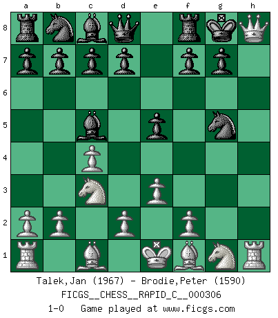 Last move : 1-0 2025 February 4 0:8:40 [Event "FICGS__CHESS__RAPID_C__000306"] [Site "FICGS"] [Date "2025.01.21"] [Round "1"] [White "Talek,Jan"] [Black "Brodie,Peter"] [Result "1-0"] [WhiteElo "1967"] [BlackElo "1590"] 1.h4 e5 2.c4 Bc5 3.e3 Nf6 4.Nc3 O-O 5.g4 h6 6.g5 hxg5 7.hxg5 Nh7 8.Qh5 Nxg5 9.Qh8+ 1-0 Follow this game move after move (download)Excellence at Chess is one mark of a scheming mind. (Sir Arthur Conan Doyle) Es gibt Leute, die glauben, alles wäre vernünftig, was man mit einem ernsthaften Gesicht tut. (Georg Christoph Lichtenberg) El Ajedrez es una manera fabulosa para que los niños aprendan a autovalorarse y a autoestimarse. (Saudin Robovic) J'apprécie les joueurs d'est-indienne, c'est grâce à eux que je nourris ma famille depuis tant d'années. (Petrosian) Before all elsed, be armed. (Niccolo Machiavelli)