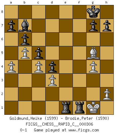 Last move : 0-1 2025 May 28 22:50:29 [Event "FICGS__CHESS__RAPID_C__000306"] [Site "FICGS"] [Date "2025.01.21"] [Round "1"] [White "Goldmund,Heike"] [Black "Brodie,Peter"] [Result "0-1"] [WhiteElo "1599"] [BlackElo "1590"] 1.b4 e5 2.Bb2 Nc6 3.b5 Nd4 4.e3 Ne6 5.Bxe5 f6 6.Bb2 c6 7.c4 Ne7 8.a4 Nf5 9.Nf3 Be7 10.d3 O-O 11.Be2 Bb4+ 12.Nbd2 Bxd2+ 13.Qxd2 Nc5 14.O-O Nb3 15.Qc3 Nxa1 16.Rxa1 d6 17.e4 Ne7 18.Qb4 c5 19.Qc3 Ng6 20.Rd1 Nf4 21.Bf1 Ne6 22.Nh4 Nd4 23.Re1 f5 24.Nxf5 Nxf5 25.exf5 Qf6 26.Qd2 Qf7 27.g4 d5 28.Ba3 b6 29.Bg2 Bb7 30.Re5 d4 31.f3 Rae8 32.Qe2 Rxe5 33.Qf2 Rfe8 34.Bf1 Re3 35.Bc1 Rxf3 36.Qh4 Qe7 37.Qxe7 Rxe7 38.Bg5 Re1 39.Kg2 Rxf5 40.Kg1 R5xf1+ 0-1 Follow this game move after move (download)Chess holds its master in its own bonds, shackling the mind and brain so that the inner freedom of the very strongest must suffer. (Albert Einstein) Die größte Kunst beim Schach besteht darin dem Gegner nicht zu zeigen was er tun kann. (Garry Kasparov) La maestría del Ajedrez consiste esencialmente en analizar posiciónes de Ajedrez con precisión. (Mikhail Botvinnik) Les pièces de l'échiquier étaient impitoyables. Elles le retenaient, elles l'absorbaient. Il y avait de l'horreur en cela, mais aussi une harmonie unique. Car, qu'y a-t-il dans le monde, à part les échecs ? (V. Nabokov) The quality of decision is like the well-timed swoop of a falcon which enables it to strike and destroy its victim. (Sun Tzu)