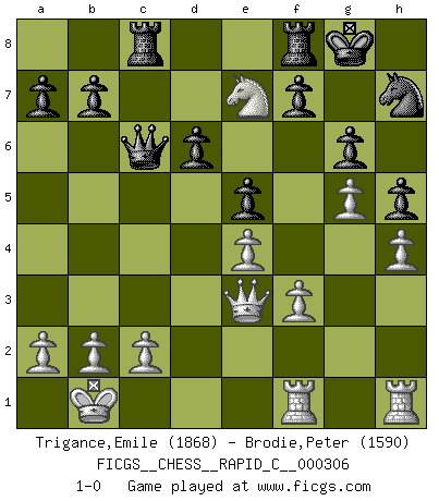Last move : 1-0 2025 April 7 20:26:41 [Event "FICGS__CHESS__RAPID_C__000306"] [Site "FICGS"] [Date "2025.01.21"] [Round "1"] [White "Trigance,Emile"] [Black "Brodie,Peter"] [Result "1-0"] [WhiteElo "1868"] [BlackElo "1590"] 1.e4 c5 2.Nf3 Nc6 3.d4 cxd4 4.Nxd4 Nxd4 5.Qxd4 Qb6 6.Qc3 Qc6 7.Qd3 e5 8.Bd2 Qd6 9.Qf3 Qf6 10.Qd1 Bc5 11.Qe2 Qe6 12.Nc3 Nf6 13.f3 O-O 14.O-O-O d6 15.Kb1 Bd7 16.Be3 Rac8 17.g4 h6 18.h4 Nh7 19.g5 h5 20.Bh3 Qe7 21.Nd5 Qe8 22.Bxd7 Qxd7 23.Rdg1 g6 24.Rf1 Bxe3 25.Qxe3 Qc6 26.Ne7+ 1-0 Follow this game move after move (download)It's just you and your opponent at the board and you're trying to prove something. (Bobby Fischer) Ich spiele ehrlich und spiele, um zu gewinnen. Wenn ich verliere nehme ich meine Medizin. (Robert James Fischer) El Ajedrez es una guerra en un tablero. El objetivo es aplastar la mente del oponente. (Bobby Fischer) Le moment que je préfère le plus dans une rencontre, c'est celui où je sens que la personnalité de l'adversaire se brise. (Robert Fischer) SEO proverb : Make your website optimized for human beings, not for search engines.