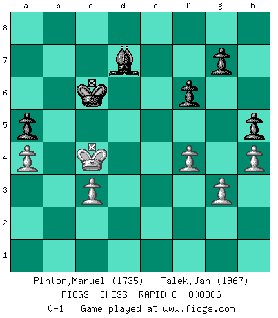 Last move : 0-1 2025 March 9 3:36:51 [Event "FICGS__CHESS__RAPID_C__000306"] [Site "FICGS"] [Date "2025.01.21"] [Round "1"] [White "Pintor,Manuel"] [Black "Talek,Jan"] [Result "0-1"] [WhiteElo "1735"] [BlackElo "1967"] 1.e4 c5 2.f4 e6 3.Nf3 d5 4.exd5 exd5 5.d4 Nc6 6.c3 Nf6 7.Bd3 cxd4 8.cxd4 Bb4+ 9.Bd2 Qb6 10.Qe2+ Kd8 11.Bxb4 Re8 12.Ne5 Qxb4+ 13.Qd2 Qxd4 14.Nc3 Nxe5 15.O-O-O Nxd3+ 16.Qxd3 Qxd3 17.Rxd3 Bf5 18.Rd2 Rc8 19.h3 b5 20.Kd1 Bd7 21.Nxd5 Nxd5 22.Rxd5 Kc7 23.Kd2 Bc6 24.Rc1 Red8 25.Rxd8 Rxd8+ 26.Ke3 Re8+ 27.Kf2 Re4 28.g3 Rc4 29.Rxc4 bxc4 30.Ke3 c3 31.bxc3 Bd7 32.h4 Bg4 33.Kd4 Kc6 34.a4 a5 35.Kc4 h5 36.Kd4 f6 37.Kc4 Bd7 0-1 Follow this game move after move (download)Chess is a terrible game. If you have no center, your opponent has a freer position. If you do have a center, then you really have something to worry about ! (Siegbert Tarrasch) Schach ist mein Leben, meine Leidenschaft, was ich gelernt habe und seit meinem 14. Lebensjahr profimässig praktiziere. Darauf zu verzichten, würde mir sehr schwer fallen. (Viktor Kortschnoi) El juego de Damas es para vagabundos. (Paul Morphy) Des points faibles ou des trous dans la position de l'adversaire doivent être occupés par des pièces et non pas par des pions. (Siegbert Tarrasch) All politicians must be presumed guilty until they are proven innocent. (Dinesh De Silva)