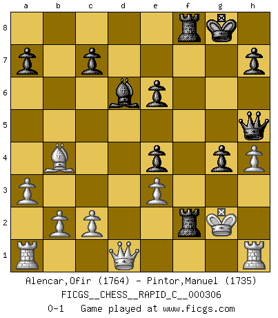 Last move : 0-1 2025 February 11 16:31:35 [Event "FICGS__CHESS__RAPID_C__000306"] [Site "FICGS"] [Date "2025.01.21"] [Round "1"] [White "Alencar,Ofir"] [Black "Pintor,Manuel"] [Result "0-1"] [WhiteElo "1764"] [BlackElo "1735"] 1.d4 d5 2.Nf3 Nc6 3.Nc3 Nf6 4.Ne5 Bf5 5.e3 e6 6.Nxc6 bxc6 7.Bd3 Ne4 8.Nxe4 dxe4 9.Bc4 Qg5 10.g3 Bg4 11.Be2 f5 12.Bxg4 fxg4 13.h4 Qh5 14.a3 c5 15.dxc5 Bxc5 16.Bd2 O-O 17.O-O g5 18.Kg2 gxh4 19.gxh4 Rf3 20.Rh1 Raf8 21.Be1 Bd6 22.Bb4 Rxf2+ 0-1 Follow this game move after move (download)Fischer is an American Chess tragedy on par with Morphy and Pillsbury. (Mig Greengard) Was ist der Unterschied zwischen einem Strassenarbeiter und einem Schachspieler? --Der Schachspieler bewegt sich ab und zu. (Anonymous) Entre mas años cumplo, mas valoro los Peones. (Keres) Les Echecs sont affaire de jugement sensible. Savoir quand frapper et quand esquiver. (Fischer) If things go wrong, don't go with them. (Roger Babson)