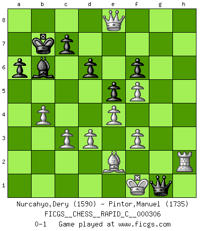 Last move : 0-1 2025 March 12 2:52:56 [Event "FICGS__CHESS__RAPID_C__000306"] [Site "FICGS"] [Date "2025.01.21"] [Round "1"] [White "Nurcahyo,Dery"] [Black "Pintor,Manuel"] [Result "0-1"] [WhiteElo "1590"] [BlackElo "1735"] 1.e4 e5 2.Nf3 Nc6 3.Nc3 Bc5 4.Nd5 Nf6 5.Nxf6+ Qxf6 6.c3 h6 7.Qb3 O-O 8.d3 d6 9.Be2 Bb6 10.O-O Be6 11.Qc2 Bg4 12.h3 Bh5 13.Be3 g5 14.g4 Bg6 15.Bc1 h5 16.Bxg5 Qg7 17.Qd2 hxg4 18.hxg4 f6 19.Bh6 Qh7 20.Bxf8 Rxf8 21.Kg2 Kf7 22.Rh1 Qg7 23.Rag1 Rh8 24.Rxh8 Qxh8 25.Rh1 Qg7 26.b4 a6 27.a4 Ke7 28.a5 Ba7 29.Nh4 Bh7 30.Kf1 Kd7 31.Nf5 Bxf5 32.gxf5 b6 33.axb6 Bxb6 34.Rg1 Qh8 35.Bf3 Ne7 36.Rh1 Qg7 37.Qa2 Qg5 38.Qe6+ Kc6 39.Qxe7 Qd2 40.Qe8+ Kb7 41.Be2 Qf4 42.f3 Qg3 43.Rh2 Qg1+ 0-1 Follow this game move after move (download)You must take your opponent into a deep dark forest where 2+2=5, and the path leading out is only wide enough for one. (Mikhail Tal) Auf Remis zu spielen ist gewissermaßen ein Verbrechen gegen das Schachspiel. (Mikhail Nekhemyevich Tal) Solo puedes ser bueno en el Ajedrez si amas al juego. (Bobby Fischer) Il n'y a pas de prix trop élevé au scalp de l'ennemi. (Koblentz) I find your interest interesting. (Gregory House, House M.D.)
