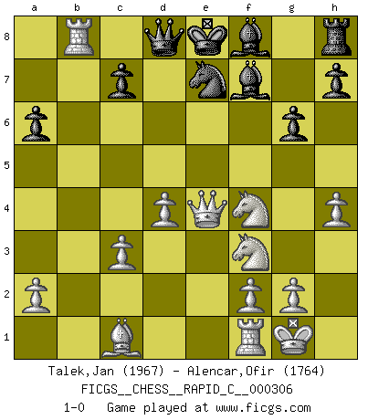 Last move : 1-0 2025 February 20 17:27:7 [Event "FICGS__CHESS__RAPID_C__000306"] [Site "FICGS"] [Date "2025.01.21"] [Round "1"] [White "Talek,Jan"] [Black "Alencar,Ofir"] [Result "1-0"] [WhiteElo "1967"] [BlackElo "1764"] 1.Na3 d5 2.Nf3 d4 3.c3 dxc3 4.bxc3 Nc6 5.Nc4 Nf6 6.d4 Ne4 7.Qc2 Nd6 8.e4 e6 9.Ne3 f6 10.h4 Bd7 11.Rb1 a6 12.Be2 f5 13.exf5 exf5 14.Bd3 Ne4 15.O-O g6 16.Nd5 Be6 17.Nf4 Bf7 18.Rxb7 Rb8 19.Bxe4 fxe4 20.Qxe4+ Ne7 21.Rxb8 1-0 Follow this game move after move (download)Chess is above all, a fight ! (Emanuel Lasker) Man kann eine Schachpartie nur gewinnen, wenn das Gleichgewicht gestört ist. In einer Stellung mit ungestörtem Gleichgewicht ist auch das größte Genie hilflos - in der Stellung steckt dann eben kein genialer Einfall. (Wilhelm Steinitz) Aquel que toma al Peón de Caballo de la Reina, se pasará la noche a dormir en la calle. (Anónimo) Les Cavaliers se révèlent fort utiles dans les positions fermées. D'habitude, les Fous sont un peu plus forts que les Cavaliers dans les positions ouvertes. Qu'on le veuille ou non, il restera toujours des exceptions ! Patience, use the Force, think ! (Obi-Wan Kenobi in Star Wars ep.2)