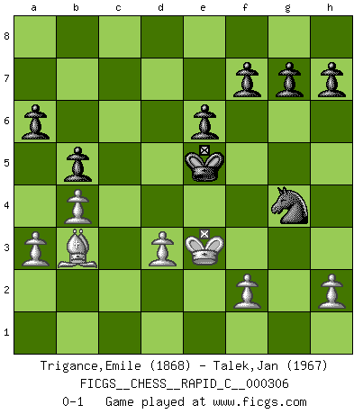 Last move : 0-1 2025 April 23 3:44:46 [Event "FICGS__CHESS__RAPID_C__000306"] [Site "FICGS"] [Date "2025.01.21"] [Round "1"] [White "Trigance,Emile"] [Black "Talek,Jan"] [Result "0-1"] [WhiteElo "1868"] [BlackElo "1967"] 1.e4 e6 2.d4 d5 3.Nd2 c5 4.exd5 Qxd5 5.Ngf3 cxd4 6.Bc4 Qd6 7.O-O Nf6 8.Nb3 Nc6 9.Nbxd4 Nxd4 10.Qxd4 Qxd4 11.Nxd4 Bc5 12.Nb5 O-O 13.Bf4 Bd7 14.Rad1 Bc6 15.Nc3 a6 16.a3 Rfe8 17.b4 Be7 18.Bd6 Rac8 19.Bxe7 Rxe7 20.Bb3 Bxg2 21.Kxg2 Rxc3 22.Rd8+ Re8 23.Rfd1 Kf8 24.Rxe8+ Kxe8 25.Ba4+ b5 26.Bb3 Ke7 27.Rd3 Rxd3 28.cxd3 Kd6 29.Kf3 Ke5 30.Ke3 Ng4+ 0-1 This chess game has been lost on time (started : 2025.01.21 12:58:40) Follow this game move after move (download)There are two types of sacrifices: correct ones and mine. (Mikhail Tal) Im Schach nämlich geht es darum, daß Ich des Gegners klein zu kriegen, sein Ego zu zerbrechen und zu zermahlen, seine Selbstachtung zu zertreten und zu verscharren und seine ganze mißachtenswerte sogenannte Persönlichkeit ein für alle Mal tot zu hacken und zu zerstampfen und dadurch die menschliche Gesellschaft von einer stinkenden Pestbeule zu befreien. Es ist ein königliches Spiel. (Robert James Fischer) La enorme capacidad mental, en la que sin ella no puede un jugador de Ajedrez existir, es demasiado requerida por el Ajedrez al grado de que nunca podrá liberar su mente de este juego. (Albert Einstein) La vérité est comme le meilleur coup aux échecs : elle existe, mais il faut la chercher. (Arturo Perez-Reverte) When you've done things right people won't know you've done anything at all. (Futurama)