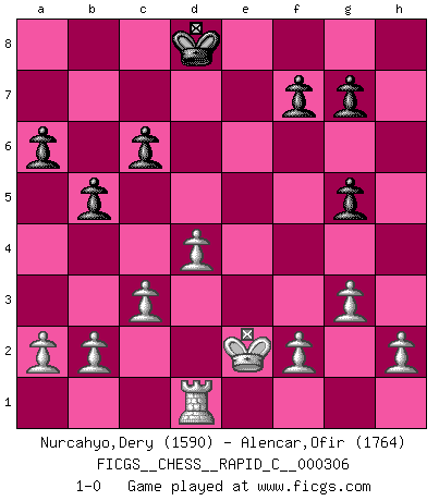 Last move : 1-0 2025 February 16 10:24:1 [Event "FICGS__CHESS__RAPID_C__000306"] [Site "FICGS"] [Date "2025.01.21"] [Round "1"] [White "Nurcahyo,Dery"] [Black "Alencar,Ofir"] [Result "1-0"] [WhiteElo "1590"] [BlackElo "1764"] 1.e4 d5 2.exd5 Qxd5 3.Ne2 Qd8 4.Nbc3 e5 5.d3 Nc6 6.Be3 Nd4 7.Ne4 Nxe2 8.Bxe2 Nf6 9.Bg5 Be7 10.Nxf6+ Bxf6 11.Be3 Be6 12.Bf3 c6 13.O-O e4 14.Bxe4 Bd5 15.Bxd5 Qxd5 16.c3 O-O-O 17.Qg4+ Qd7 18.Qxd7+ Rxd7 19.d4 Re8 20.Rad1 h6 21.Rfe1 a6 22.g3 b5 23.Kf1 Bg5 24.Bxg5 hxg5 25.Rxe8+ Rd8 26.Rxd8+ Kxd8 27.Ke2 1-0 Follow this game move after move (download)A win by an unsound combination, however showy, fills me with artistic horror. (Wilhelm Steinitz) Es macht mich traurig, wenn ich sehe, dass Golfprofis mehr verdienen als Schachsportler. Obwohl ich davon überzeugt bin, dass wir Schachspieler viel härter trainieren müssen als die Golfer. (Alexandra Kosteniuk) ¿Quién es tu oponente esta tarde? Esta tarde mi oponente son las piezas negras. (Akiba Rubinstein) Il vaut mieux sacrifier les pièces de l'adversaire. (Xavier Tartacover) Do not put your faith in what statistics say until you have carefully considered what they do not say. (William W. Watt)