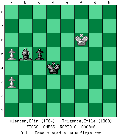 Last move : 0-1 2025 April 14 13:45:27 [Event "FICGS__CHESS__RAPID_C__000306"] [Site "FICGS"] [Date "2025.01.21"] [Round "1"] [White "Alencar,Ofir"] [Black "Trigance,Emile"] [Result "0-1"] [WhiteElo "1764"] [BlackElo "1868"] 1.d4 d5 2.Nf3 Nf6 3.Ne5 Nbd7 4.Nxd7 Bxd7 5.Nc3 e6 6.f3 Bc6 7.g3 h6 8.e3 a6 9.Bd3 Be7 10.a3 O-O 11.Bd2 Nd7 12.Ne2 b5 13.b4 e5 14.dxe5 Nxe5 15.Nf4 d4 16.e4 Nc4 17.Bxc4 bxc4 18.c3 Bf6 19.cxd4 Bxd4 20.Rc1 c3 21.Bxc3 Bxc3+ 22.Rxc3 Qxd1+ 23.Kxd1 Ba4+ 24.Ke2 c6 25.Nd3 Bb5 26.Rd1 Rad8 27.Ke3 Rd7 28.h4 Rfd8 29.Nf2 Rxd1 30.Nxd1 Rxd1 31.g4 Kf8 32.h5 Ke7 33.Kf4 Ke6 34.g5 hxg5+ 35.Kxg5 Rg1+ 36.Kf4 f6 37.Re3 g5+ 38.hxg6 Rxg6 39.e5 fxe5+ 40.Rxe5+ Kf7 41.Rf5+ Ke7 42.Rg5 Rh6 43.Rc5 Rh4+ 44.Kg3 Rh6 45.f4 Kd6 46.f5 a5 47.bxa5 Kxc5 48.Kf4 Kd4 49.Kg5 Rd6 50.f6 Rxf6 51.Kxf6 c5 0-1 Follow this game move after move (download)Of all my Russian books, the defense contains and diffuses the greatest 'warmth' which may seem odd seeing how supremely abstract Chess is supposed to be. (Vladimir Nabokov) Die Auseinandersetzung mit Karpow war politisch geprägt. Er stand für das kommunistische System, wurde von dessen Repräsentanten gehätschelt. Ich war der Oppositionelle. Jeder Schachweltmeister spiegelt auch die gesellschaftlichen Verhältnisse wider. Kramnik steht für die Börsen-Generation des Neuen Markts, ideologiefrei, zahlenfixiert. (Garry Kasparov) Cuando estes solo, cuando te sientas un extraño en el mundo, juega al Ajedrez. Esto levantará tu espiritu y será tu consejero de guerra. (Aristóteles) Soyez une menace à chaque fois que vous vous asseyez pour jouer. (Ken Smith) Life is like a play: it's not the length but the excellence of the acting that matters. (Seneca)
