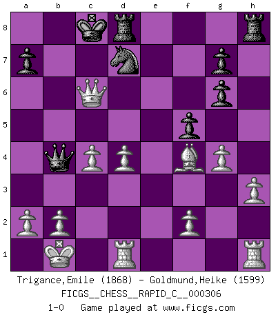 Last move : 1-0 2025 March 23 17:48:54 [Event "FICGS__CHESS__RAPID_C__000306"] [Site "FICGS"] [Date "2025.01.21"] [Round "1"] [White "Trigance,Emile"] [Black "Goldmund,Heike"] [Result "1-0"] [WhiteElo "1868"] [BlackElo "1599"] 1.e4 d5 2.exd5 Qxd5 3.Nc3 Qa5 4.d4 Nf6 5.Nf3 Bg4 6.h3 Bh5 7.Be2 e6 8.g4 Bg6 9.Ne5 Bd6 10.Nxg6 hxg6 11.Bf3 c6 12.Bd2 Qc7 13.Qe2 Nbd7 14.O-O-O O-O-O 15.Bg2 Nb6 16.Kb1 Nfd5 17.Ne4 f5 18.Nxd6+ Qxd6 19.c4 Nf4 20.Bxf4 Qb4 21.Qxe6+ Nd7 22.Bxc6 bxc6 23.Qxc6+ 1-0 Follow this game move after move (download)The isolated Pawn casts gloom over the entire chessboard. (Aaron Nimzovich) Der Verteidiger gebe der Gewalt nach, aber nur der Gewalt. Er schaffe sich nicht freiwillig, etwa aus Blindheit oder aus Schrecken, irgendwelche Schwächen. Er lasse sich nicht bluffen. (Emanuel Lasker) Fischer era un maestro de claridad y un Rey del posicionamiento astuto. Sus oponentes podían ver hacia donde se dirigía pero eran impotentes para detenerlo. (Bruce Pandolfini) C'est une question de caractère, Beaucoup de gens perdent leur motivation très vite. D'autres, ils sont rares, peuvent la conserver très longtemps. J'aime les échecs, encore aujourd'hui je suis heureux d'analyser des parties. J'aime toujours gagner, je déteste encore perdre. Bien jouer est important pour mon intégrité intellectuelle et morale. Et puis les échecs vivent en ce moment une période historique grâce à Internet. Ils se développent dans les systèmes éducatifs à travers le monde. Ils sortent de leur ghetto, et c'est mon rôle de mener à bien cette révolution. (Gary Kasparov) They say poker is a zero-sum game. It must be, because every time I play my sum ends up zero. (Max Shapiro)