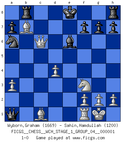 Last move : 1-0 2006 September 21 14:16:16 [Event "FICGS__CHESS__WCH_STAGE_1_GROUP_04__000001"] [Site "FICGS"] [Date "2006.07.01"] [Round "1"] [White "Wyborn,Graham"] [Black "Sahin,Hamdullah"] [Result "1-0"] [WhiteElo "1669"] [BlackElo "1200"] 1.d4 d5 2.c4 e6 3.Nf3 Nf6 4.Nc3 Bb4 5.a3 Bxc3+ 6.bxc3 Ne4 7.Qc2 Na6 8.e3 c5 9.Bd3 cxd4 10.exd4 Qa5 11.O-O Qxc3 12.Bxe4 Qxa1 13.cxd5 Bd7 14.dxe6 Bxe6 15.Bxb7 Rb8 16.Qc6+ 1-0 This chess game has been lost on time (started : 2006.07.01 16:4:35) Queen's gambit declined Kingside Castling by player White (move 11) Player White won this chess game. Follow this game move after move (download)I feel as if I were a piece in a game of Chess, when my opponent says of it: That piece cannot be moved. (Soren Kierkegaard) Wer nie einen Fehler gemacht hat, hat nie etwas Neues ausprobiert. (Albert Einstein) El Ajedrez, como cualquier otra actividad creativa, puede existir solo a través de méritos combinados de aquellos que tienen talento creativo y de aquellos que tienen la habilidad de organizar un trabajo creativo. (Mikhail Botvinnik) Il n'y a pas de prix trop élevé au scalp de l'ennemi. (Koblentz) He is a liar. I just don't know what the lie is yet. (Horatio Caine, C.S.I. Miami)