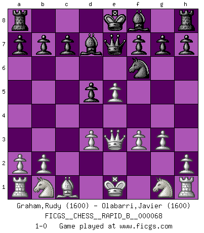 Last move : 1-0 2007 November 13 7:10:34 [Event "FICGS__CHESS__RAPID_B__000068"] [Site "FICGS"] [Date "2007.09.26"] [Round "1"] [White "Graham,Rudy"] [Black "Olabarri,Javier"] [Result "1-0"] [WhiteElo "1600"] [BlackElo "1600"] 1.g3 e5 2.e4 Nf6 3.d4 exd4 4.Qxd4 Nc6 5.Qe3 Qe7 6.f3 d5 7.Bb5 Bd7 8.Bd3 Nb4 9.e5 Nxd3+ 10.cxd3 1-0 This chess game has been lost on time (started : 2007.09.26 13:34:21) Benko's Opening Player White won this chess game. Follow this game move after move (download)Chess is as much a mystery as women. (Purdy) Modernes Schach erfordert enorme Anspannung. Es ist für einen normalen Menschen unmöglich das auszuhalten. (Viktor Kortschnoi) El Ajedrez es una hermosa aventura. (Bent Larsen) Toute estimation doit être constamment réévaluée. (Jacob Estrin) The production of too many useful things results in too many useless people. (Karl Marx)