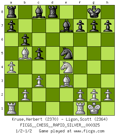 Last move : 1/2-1/2 2025 February 6 15:33:55 [Event "FICGS__CHESS__RAPID_SILVER__000325"] [Site "FICGS"] [Date "2025.01.29"] [Round "1"] [White "Kruse,Herbert"] [Black "Ligon,Scott"] [Result "1/2-1/2"] [WhiteElo "2370"] [BlackElo "2364"] 1.e4 c5 2.Ne2 Nf6 3.Nbc3 d5 4.exd5 Nxd5 5.Nxd5 Qxd5 6.d4 e5 7.dxe5 Qxe5 8.c3 Nc6 9.Bf4 Qf6 10.Qd2 Be7 11.Ng3 O-O 12.Bb5 Rd8 13.Qe3 Qe6 14.O-O Qxe3 15.Bxe3 Ne5 16.Ne4 b6 17.a4 1/2-1/2 Follow this game move after move (download)Chess is no whit inferior to the violin, and we have a large number of professional violinists. (Mikhail Botvinnik) Wenn ich gewinne bin ich ein Genie. Wenn nicht, dann bin ich keines. (Robert James Fischer) Hoy en día, si tu no eres un Gran Maestro a los 14 años, es mejor que lo olvides. (Anand Viswanathan) Votre seul travail dans les ouvertures est d'obtenir un milieu de partie jouable. (Lajos Portish) When it is a question of money, everybody is of the same religion. (Voltaire)