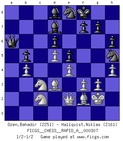 Last move : 1/2-1/2 2025 March 8 13:32:46 [Event "FICGS__CHESS__RAPID_A__000307"] [Site "FICGS"] [Date "2025.01.29"] [Round "1"] [White "Ozen,Bahadir"] [Black "Hallqvist,Niklas"] [Result "1/2-1/2"] [WhiteElo "2251"] [BlackElo "2161"] 1.d4 e6 2.c4 b6 3.e4 Bb7 4.Bd3 Bb4+ 5.Kf1 Be7 6.Nc3 d6 7.Nf3 Nd7 8.h4 e5 9.d5 a5 10.Be3 Nc5 11.Bc2 Nf6 12.g3 O-O 13.Kg2 Ng4 14.Bd2 c6 15.Ng5 Nf6 16.f3 h6 17.Nh3 cxd5 18.cxd5 Bc8 19.a3 Bd7 20.b4 axb4 21.axb4 Na6 22.Rb1 b5 23.Qe2 Qb6 24.Bd3 Nc7 25.Ra1 Qb7 26.Nf2 Rfc8 27.Rhb1 Bd8 28.Nfd1 Rab8 29.Be1 Ra8 30.Ne3 Rxa1 31.Rxa1 Rb8 32.Ra3 Qc8 33.Kh2 Qb7 34.Ra1 Kh7 35.Nc2 Ra8 36.Ra5 Rb8 37.Ra3 Ra8 38.Kg2 Ra6 39.Rxa6 Qxa6 40.Bf2 Nh5 41.Qd2 Kg8 42.Qe3 Ne8 43.Qe2 Nc7 44.Qe1 Kf8 45.Qe3 Ne8 46.Qe2 Nc7 47.Qe3 Ne8 48.Qe2 1/2-1/2 Follow this game move after move (download)A big shock; the best chess player in history has passed away. (Lajos Portisch, about Bobby Fischer's death) Karpov ist ein Museumsstück. (Garry Kasparov) Las piezas de Ajedrez son los bloques del alfabeto que moldean los pensamientos; y esos pensamientos, aunque hagan un diseño visual en el tablero, expresan abstractamente su belleza como un poema. (Marcel Duchamp) Les échecs, c'est la lutte contre l'erreur. (Johannes Zukertort) I don't believe in psychology. I believe in good moves. (Bobby Fischer)