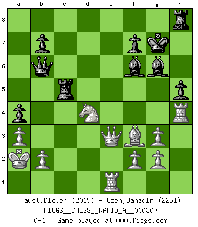 Last move : 0-1 2025 March 4 7:26:41 [Event "FICGS__CHESS__RAPID_A__000307"] [Site "FICGS"] [Date "2025.01.29"] [Round "1"] [White "Faust,Dieter"] [Black "Ozen,Bahadir"] [Result "0-1"] [WhiteElo "2069"] [BlackElo "2251"] 1.d4 Nf6 2.Nf3 e6 3.Bg5 h6 4.Bh4 c5 5.c3 Qb6 6.Qc2 Nc6 7.e3 d5 8.Be2 Ne4 9.Nbd2 g5 10.Bg3 Nxg3 11.hxg3 cxd4 12.exd4 g4 13.Ne5 Nxe5 14.dxe5 Bc5 15.Rf1 h5 16.Nb3 Bf8 17.O-O-O Bg7 18.Rde1 Bxe5 19.Bxg4 Bg7 20.Bf3 Kf8 21.Qe2 a5 22.Nd4 a4 23.a3 Ra5 24.Kb1 Rc5 25.Qe3 e5 26.Rh1 Bf6 27.Nc2 d4 28.cxd4 exd4 29.Nxd4 Bf5+ 30.Ka2 Bg6 31.Rh4 Kg7 0-1 Follow this game move after move (download)On the chessboard, lies and hypocrisy do not survive long. (Emanuel Lasker) Das Schachspiel ist ein See, in welchem eine Mücke baden und ein Elefant ertrinken kann. (Emanuel Lasker) No hay otro maestro que tenga una voluntad terrífica de ganar. Al tablero, el irradía peligro y aún los oponentes mas fuertes tienden a congelarse como liebres cuando olfatean a una pantera. Aún sus debilidades son peligrosas. Con las blancas, su juego de apertura es predecible - te es posible hacer planes en su contra - pero es tan fuerte que tus planes casi nunca funcionan. En el juego medio, su precisión e invención son fabulosas y en finales, tú simplemente no le puedes vencer. (Experto Alemán anónimo) Pour moi, les échecs ne sont pas un jeu mais un art. (Alexandre Alekhine) Tomorrow's what you make of it. (Horatio Caine, C.S.I. Miami)