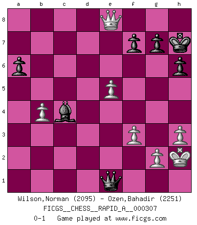 Last move : 0-1 2025 February 14 14:12:33 [Event "FICGS__CHESS__RAPID_A__000307"] [Site "FICGS"] [Date "2025.01.29"] [Round "1"] [White "Wilson,Norman"] [Black "Ozen,Bahadir"] [Result "0-1"] [WhiteElo "2095"] [BlackElo "2251"] 1.d4 Nf6 2.c4 e6 3.Nf3 d5 4.Nc3 Be7 5.e3 O-O 6.a3 c5 7.cxd5 cxd4 8.exd4 exd5 9.h3 Re8 10.Be3 Bf5 11.Bb5 Nc6 12.O-O a6 13.Bxc6 bxc6 14.Ne5 Rc8 15.Rc1 Bd6 16.Qf3 Bg6 17.Bf4 Ne4 18.b4 Bxe5 19.dxe5 c5 20.Rfd1 Nxc3 21.Rxc3 Be4 22.Qe3 cxb4 23.Rxc8 Qxc8 24.axb4 Qb7 25.Qc5 Bf5 26.Qa5 h6 27.Rxd5 Be4 28.Rd8 Rxd8 29.Qxd8+ Kh7 30.f3 Bd5 31.Bg3 Bc4 32.Be1 Qd5 33.Qe8 Qd1 34.Kh2 Qxe1 0-1 Follow this game move after move (download)In Chess, just as in life, today's bliss may be tomorrow's poison. (Assaic) Mit Schach schule ich mein Gefühl für Geometrie, was für Tennis und Schach gleichermaßen wichtig ist. (Boris Becker) Vive, pierde y aprende al observar a tu oponente como ganar. (Amber Steenbock) Même un GMI sait rarement calculer sur plus de cinq coups une attaque à sacrifices. (Rudolf Spielmann) Beep ! (R2D2 in Star Wars ep.3)