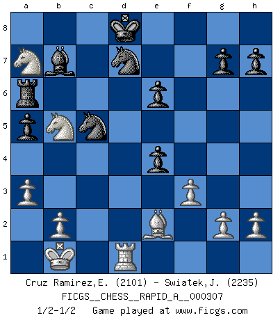 Last move : 1/2-1/2 2025 April 16 8:7:17 [Event "FICGS__CHESS__RAPID_A__000307"] [Site "FICGS"] [Date "2025.01.29"] [Round "1"] [White "Cruz Ramirez,Eliecer"] [Black "Swiatek,Janusz"] [Result "1/2-1/2"] [WhiteElo "2101"] [BlackElo "2235"] 1.e4 c5 2.c3 Nf6 3.e5 Nd5 4.Nf3 d6 5.exd6 e6 6.d4 Bxd6 7.c4 Nf6 8.dxc5 Bxc5 9.Qxd8+ Kxd8 10.Nc3 Ke7 11.a3 a5 12.Bf4 Bd7 13.O-O-O Rd8 14.Bc7 Rc8 15.Bg3 Nh5 16.Bh4+ f6 17.Nd2 Bd4 18.Nde4 Be5 19.f3 Bc6 20.Bf2 Nd7 21.c5 Nf4 22.Kb1 Nd5 23.Nb5 b6 24.cxb6 N5xb6 25.Ned6 Rcb8 26.Rc1 Bd5 27.Bg3 Na4 28.Bxe5 fxe5 29.Rc7 Ra6 30.Nc8+ Kd8 31.Nca7 e4 32.Be2 Rb7 33.Rxb7 Bxb7 34.Rd1 Nac5 1/2-1/2 Follow this game move after move (download)The stomach is an essential part of the Chess master. (Bent Larsen) Ein Schachgenie ist jemand der verdammt gut Schach spielt. (Jonathan Levitt) Siempre es mejor sacrificar los hombres de tu oponente. (Savielly Tartakower) Il n'y a pas eu de défaite parce que je ne crois pas que cet ordinateur ait jamais existé. IBM a triché en refusant d'imprimer les modes de recherche de la machine. C'est évident, pendant le match, des coups décisifs ont été joués par des êtres humains. Aujourd'hui, les meilleurs spécialistes en informatique ne peuvent toujours pas expliquer comment Deep-Blue a pu jouer contre la logique des ordinateurs. IBM a gagné une guerre de communication, mais ils sont incapables de prouver que l'ordinateur a gagné tout seul. (Garry Kasparov) Rules and bones are meant to be broken. (Anonymous)