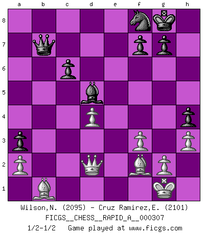 Last move : 1/2-1/2 2025 March 25 8:52:19 [Event "FICGS__CHESS__RAPID_A__000307"] [Site "FICGS"] [Date "2025.01.29"] [Round "1"] [White "Wilson,Norman"] [Black "Cruz Ramirez,Eliecer"] [Result "1/2-1/2"] [WhiteElo "2095"] [BlackElo "2101"] 1.e4 e5 2.Nf3 Nc6 3.Bc4 Bc5 4.d3 Nf6 5.c3 d6 6.Nbd2 O-O 7.O-O a5 8.h3 Be6 9.Bb5 Ba7 10.Re1 Ne7 11.d4 Ng6 12.Ba4 Nh5 13.Nf1 Nhf4 14.Bc2 Qd7 15.Ne3 exd4 16.Nxd4 Bxd4 17.cxd4 d5 18.exd5 Nxd5 19.Nxd5 Bxd5 20.Bd2 b6 21.Bd3 Rae8 22.Qc2 Re6 23.Rxe6 Bxe6 24.Be3 Bd5 25.Re1 Re8 26.f3 c6 27.Re2 Nf8 28.b3 Qd6 29.Bf2 Rxe2 30.Qxe2 h5 31.Bb1 b5 32.Qe1 a4 33.bxa4 bxa4 34.Bg3 Qa3 35.Qd2 Qe7 36.Qb2 h4 37.Bf2 a3 38.Qd2 Qb7 1/2-1/2 Follow this game move after move (download)Chess is a beautiful mistress. (Bent Larsen) Man gibt nur Pakete auf. (Paul Keres) Aquellos que dicen entender al Ajedrez, no entienden nada. (Robert Hubner) Nous vivons dans un monde échiquéen : chaque jour qui passe est un défi à relever. (Philosophe Sasha) I find your interest interesting. (Gregory House, House M.D.)
