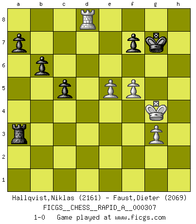 Last move : 1-0 2025 March 25 7:50:36 [Event "FICGS__CHESS__RAPID_A__000307"] [Site "FICGS"] [Date "2025.01.29"] [Round "1"] [White "Hallqvist,Niklas"] [Black "Faust,Dieter"] [Result "1-0"] [WhiteElo "2161"] [BlackElo "2069"] 1.d4 Nf6 2.c4 e6 3.g3 d5 4.Bg2 dxc4 5.Nf3 Nc6 6.Qa4 Bb4+ 7.Bd2 Be7 8.O-O O-O 9.Rd1 Nd5 10.Qxc4 Nb6 11.Qd3 e5 12.Nxe5 Nxe5 13.dxe5 Qxd3 14.exd3 Rd8 15.Ba5 Bg4 16.Re1 c6 17.Be4 Rd7 18.Nc3 g6 19.Rac1 Re8 20.Kg2 Be6 21.h3 Nd5 22.Nxd5 Bxd5 23.a3 Bd8 24.Bc3 Bxe4+ 25.dxe4 Bc7 26.f4 Red8 27.h4 Rd3 28.h5 Bb6 29.hxg6 hxg6 30.Bb4 R8d7 31.Re2 Bd4 32.Kh3 Be3 33.Rf1 c5 34.Bc3 Bd2 35.Bxd2 Rxd2 36.Rxd2 Rxd2 37.Rc1 b6 38.Kg4 Rxb2 39.Rd1 Re2 40.Kf3 Ra2 41.Rd8+ Kg7 42.f5 Rxa3+ 43.Kg4 gxf5+ 44.exf5 1-0 Follow this game move after move (download)A good sacrifice is one that is not necessarily sound but leaves your opponent dazed and confused. (Rudolph Spielmann) Bis jetzt ist Weiß einer wohlbekannten Analyse gefolgt. Aber jetzt begeht er einen schrecklichen Fehler: Er beginnt seinen eigenen Kopf zu benutzen. (Siegbert Tarrasch) El sobresalir en el Ajedrez es un signo de una mente intrigante. (Sir Arthur Conan Doyle) Les échecs sont utiles à l'exercice de la faculté de penser et à celle de l'imagination. Car nous devons posséder une méthode élaborée pour atteindre des buts partout où nous devons conduire notre raison. (Leibnitz) History is a gallery of pictures in which there are few originals and many copies. (Alexis de Tocqueville)