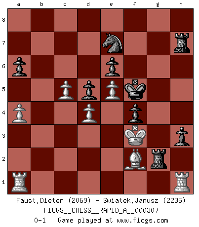 Last move : 0-1 2025 May 27 9:7:43 [Event "FICGS__CHESS__RAPID_A__000307"] [Site "FICGS"] [Date "2025.01.29"] [Round "1"] [White "Faust,Dieter"] [Black "Swiatek,Janusz"] [Result "0-1"] [WhiteElo "2069"] [BlackElo "2235"] 1.d4 d5 2.Bf4 c5 3.e3 cxd4 4.exd4 Nc6 5.c3 Bf5 6.Bd3 Bxd3 7.Qxd3 Nf6 8.Nd2 e6 9.Ngf3 Be7 10.O-O Nh5 11.Be3 O-O 12.Ne5 Qc7 13.f4 f5 14.Rac1 Nf6 15.c4 Qa5 16.c5 Qc7 17.Nb1 Ne4 18.Nc3 Bf6 19.a3 a6 20.b4 Bxe5 21.fxe5 h6 22.Rb1 g5 23.Rbe1 Qh7 24.Bd2 Rf7 25.Bc1 Qg6 26.Re2 Raf8 27.Rb2 Nxc3 28.Qxc3 f4 29.Rbf2 Ne7 30.Qd2 Qe4 31.Re2 Qh7 32.Ref2 h5 33.Qc2 Qxc2 34.Rxc2 Nf5 35.Rd1 Kh7 36.a4 h4 37.Rc3 Kg6 38.Rcd3 Rh8 39.Kf2 R7f8 40.Rg1 Rb8 41.Bd2 Ne7 42.Kf3 Kf5 43.h3 Rhg8 44.Rf1 Rbf8 45.Be1 g4+ 46.hxg4+ Rxg4 47.Bf2 Rfg8 48.R3d1 Rxg2 49.b5 h3 50.Rh1 Rh8 51.Ra1 Rh7 52.bxa6 bxa6 0-1 Follow this game move after move (download)Nowadays, when you're not a grandmaster at 14, you can forget about it. (Anand Viswanathan) Ein Gewinn durch eine ungenaue Kombination, sei sie auch noch so vorzeigbar, erfüllt mich mit Schaudern. (Wilhelm Steinitz) Evita las multitudes. Haz independientemente tu propio razonamiento. Trata de ser el jugador de Ajedrez, no la pieza de Ajedrez. (Ralph Charell) Celui qui prend des risques peut perdre, celui qui n'en prend pas perd toujours. (Xavier Tartacover) Some people are so afraid to die that they never begin to live. (Henry Van Dyke)