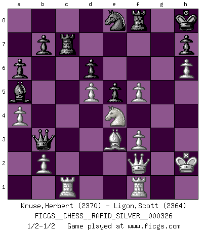 Last move : 1/2-1/2 2025 February 17 18:15:9 [Event "FICGS__CHESS__RAPID_SILVER__000326"] [Site "FICGS"] [Date "2025.01.31"] [Round "1"] [White "Kruse,Herbert"] [Black "Ligon,Scott"] [Result "1/2-1/2"] [WhiteElo "2370"] [BlackElo "2364"] 1.e4 c5 2.Nc3 Nc6 3.Nge2 Nd4 4.h4 a6 5.d3 d6 6.Nxd4 cxd4 7.Ne2 e5 8.c3 dxc3 9.Nxc3 Nf6 10.d4 Qb6 11.d5 Be7 12.Bd3 O-O 13.a4 Ng4 14.Qe2 Qd4 15.Bb1 Bd7 16.f3 Nf6 17.Be3 Qb4 18.Qd2 Bd8 19.h5 Ba5 20.h6 g6 21.g4 Rac8 22.O-O Ne8 23.Qf2 f5 24.exf5 gxf5 25.Bxf5 Bxf5 26.gxf5 Kh8 27.Rac1 Rc7 28.Ne4 Qb3 29.Kh2 1/2-1/2 Follow this game move after move (download)Chess books should be used as we use glasses: to assist the sight, although some players make use of them as if they thought they conferred sight. (Jose Raul Capablanca) Schach ist wie eine schöne Frau, zu der wir ständig zurückkehren, gleichviel, wie oft sie uns zurückweist. (Anonymous) La partida mas dura de ganar es una partida ganada. (Emanuel Lasker) C'est la seule position que je connaisse où les deux camps sont mals. Propos prêtés à V. Anand. Statistics can be made to prove anything - even the truth. (Author unknown)