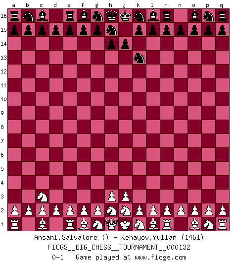 Last move : 0-1 2025 March 7 10:33:45 [Event "FICGS__BIG_CHESS__TOURNAMENT__000132"] [Site "FICGS"] [Date "2025.02.01"] [Round "1"] [White "Ansani,Salvatore"] [Black "Kehayov,Yulian"] [Result "0-1"] [WhiteElo ""] [BlackElo "1461"] 1.b1-c3 j15-k13 0-1 This big chess game has been lost on time (started : 2025.02.01 10:29:37) Follow this game move after move (download)The Pawns are the soul of the game. (Francois Andre Danican Philidor) Am wohlsten fühle ich mich, wenn ich sehe, wie sich mein Gegner im Todeskampf windet. (Robert James Fischer) El muchacho (en ese entonces un niño de 12 años llamado Anatoly Karpov) no tiene ni idea de lo que es el Ajedrez y no hay futuro en absoluto para el en esta profesión. (Mikhail Botvinnik) Mais l'homme est une créature légère et illogique : semblable au joueur d'échecs, il n'aime que le processus du but à atteindre, non le but lui-même. (Dostoïevsky) Fortune favours the audacious. (Desiderius Erasmus)