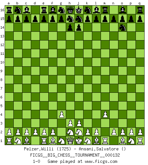 Last move : 1-0 2025 March 6 14:52:44 [Event "FICGS__BIG_CHESS__TOURNAMENT__000132"] [Site "FICGS"] [Date "2025.02.01"] [Round "1"] [White "Pelzer,Willi"] [Black "Ansani,Salvatore"] [Result "1-0"] [WhiteElo "1725"] [BlackElo ""] 1.g2-g4 p16-o14 2.m2-m4 1-0 This big chess game has been lost on time (started : 2025.02.01 10:29:37) Follow this game move after move (download)Of all my Russian books, the defense contains and diffuses the greatest 'warmth' which may seem odd seeing how supremely abstract Chess is supposed to be. (Vladimir Nabokov) Der Traum, für den ich lebe, ist der von einem freien Russland. Viele mögen sagen: Russland hat doch ein Parlament, einen gewählten Präsidenten. Aber ich spüre, dass in meiner Heimat die Angst wiederkehrt. Eine Angst, sich frei zu äußern, bestimmte Dinge zu tun (Garry Kasparov) Todos los jugadores de Ajedrez deberían tener un pasatiempo. (Savielly Tartakower) Plusieurs personnes se sont demandées comment Tal faisait pour gagner... En fait, c'est très simple ! Il met ses pièces au centre de l'échiquier et les sacrifie quelque part ! (David Bronstein) Memory is a complicated thing, a relative to truth, but not its twin. (Barbara Kingsolver, Animal Dreams)