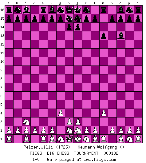 Last move : 1-0 2025 March 6 14:52:44 [Event "FICGS__BIG_CHESS__TOURNAMENT__000132"] [Site "FICGS"] [Date "2025.02.01"] [Round "1"] [White "Pelzer,Willi"] [Black "Neumann,Wolfgang"] [Result "1-0"] [WhiteElo "1725"] [BlackElo ""] 1.g2-g4 m15-m13 2.m2-m4 l16-o13 3.b1-c3 1-0 This big chess game has been lost on time (started : 2025.02.01 10:29:37) Follow this game move after move (download)For me, Chess is life and every game is like a new life. Every Chess player gets to live many lives in one lifetime. (Eduard Gufeld) Du kannst im Schach nur gut werden, wenn du das Spiel liebst. (Robert James Fischer) El jugador blanco perdió porque fallo en recordar la coreccta continuación y tuvo que pensar por sí mismo las movidas. (Siegbert Tarrasch) Il n'y a pas eu de défaite parce que je ne crois pas que cet ordinateur ait jamais existé. IBM a triché en refusant d'imprimer les modes de recherche de la machine. C'est évident, pendant le match, des coups décisifs ont été joués par des êtres humains. Aujourd'hui, les meilleurs spécialistes en informatique ne peuvent toujours pas expliquer comment Deep-Blue a pu jouer contre la logique des ordinateurs. IBM a gagné une guerre de communication, mais ils sont incapables de prouver que l'ordinateur a gagné tout seul. (Garry Kasparov) Games, world of games... There's always an opponent, and there's always a victim. (Revolver, movie)