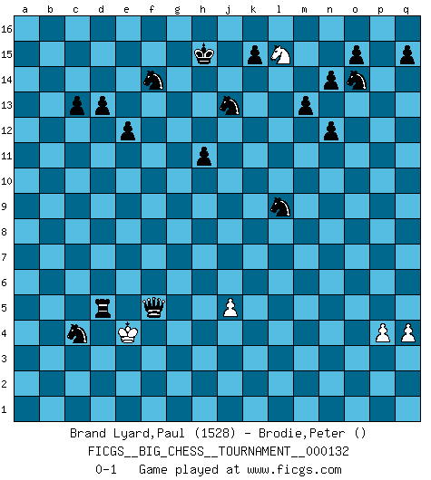 Last move : 0-1 2025 April 29 8:20:6 [Event "FICGS__BIG_CHESS__TOURNAMENT__000132"] [Site "FICGS"] [Date "2025.02.01"] [Round "1"] [White "Brand Lyard,Paul"] [Black "Brodie,Peter"] [Result "0-1"] [WhiteElo "1528"] [BlackElo ""] 1.m2-m4 g15-g13 2.l1-q6 k16-l14 3.n2-n3 h16-f14 4.f2-f3 n15-n14 5.o1-c12 e15-e14 6.e2-e4 d15-d13 7.c12-b13 c15-c14 8.b13-e10 h14-h13 9.d2-d3 f16-q6 10.c1-o12 o16-m14 11.o12-m14 l15-m14 12.j2-k4 f14-b10 13.h1-n6 b10-b2 14.b1-d2 b2-d4 15.j1-h1 q6-j13 16.d2-b3 d4-k10 17.e10-f11 g13-g12 18.f11-g12 h13-g12 19.f1-e2 k10-n13 20.n6-n13 m14-n13 21.p1-o3 j13-l11 22.a1-c1 g16-f14 23.f3-f4 e14-e13 24.h2-g4 p16-o14 25.g4-f6 l11-f6 26.q2-q4 c16-f13 27.e4-e5 f6-m12 28.e2-o11 n13-n12 29.o11-p10 h15-j13 30.q1-q3 b16-d15 31.b3-c5 j15-k13 32.q3-p3 m15-m13 33.p10-o9 k13-h12 34.c5-d7 l16-m15 35.p3-p15 m16-o16 36.c1-b1 b15-b13 37.b1-b12 a15-a13 38.b12-b11 a13-a12 39.b11-p11 m12-o10 40.h3-h4 o10-p11 41.p15-p11 q16-p16 42.p11-p16 o16-p16 43.p2-p3 e16-h16 44.g1-h3 f13-b9 45.e5-e6 b9-d7 46.e6-d7 l14-k12 47.e1-e7 m15-k13 48.o9-k13 j14-k13 49.e7-k7 h12-j10 50.m1-m3 p16-l16 51.l2-l3 d15-c13 52.k7-e7 e13-e12 53.e7-e11 h16-h11 54.e11-h11 g12-h11 55.h3-g5 c13-d11 56.g5-h7 l16-l7 57.h7-f8 l7-f7 58.f8-e10 f7-d7 59.e10-d12 c14-c13 60.d12-b13 a16-b16 61.b13-d14 b16-b1 62.h1-j2 b1-b2 63.d14-f15 b2-c2 64.k1-h2 c2-a2 65.f15-h14 j16-h15 66.h14-k13 d7-d3 67.j2-k3 a2-g2 68.h2-k1 d3-d2 69.k13-l15 g2-k2 70.k3-l4 k2-k1 71.m4-m5 d2-o2 72.o3-m4 k1-f1 73.f4-f5 f1-f5 74.m3-m1 o2-f2 75.m1-a1 d11-b10 76.a1-b1 a12-a11 77.b1-b9 f5-f9 78.b9-f9 f2-f9 79.m4-l6 a11-a10 80.k4-j6 a10-a9 81.j6-h8 j10-h8 82.l6-k8 k12-j10 83.k8-j10 h8-j10 84.p3-p4 a9-a8 85.l4-k3 a8-a7 86.k3-j2 a7-a6 87.j2-h2 a6-a5 88.h2-g2 a5-a4 89.n3-n4 a4-a3 90.j3-j4 a3-a2 91.m5-m6 a2-a1 92.g2-g3 a1-a3 93.g3-g4 a3-l3 94.n4-n5 l3-n5 95.m6-m7 n5-g11 96.g4-h5 f9-h9 97.h5-j6 g11-m6 98.j6-k7 j10-l9 99.k7-j7 m6-m7 100.j7-j6 m7-k7 101.j6-j5 h9-j9 102.j5-h6 j9-h9 103.h6-g6 k7-h7 104.g6-g5 h7-h4 105.g5-g6 h4-h6 106.g6-f5 h9-f9 107.f5-g4 f9-g9 108.g4-f5 h6-g6 109.f5-e5 g6-f7 110.j4-j5 g9-e9 111.e5-d6 b10-c8 112.d6-c6 e9-e6 113.c6-d5 e6-d6 114.d5-e5 d6-d5 115.e5-e4 c8-d6 116.e4-e3 d6-c4 117.e3-e4 f7-f5 0-1 Follow this game move after move (download)It is peculiar but a fact nevertheless, that gamblers in chess always have enthusiastic followers. (Botvinnik) Wenn man heute mit 14 Jahren noch kein GM ist, kann man es vergessen. (Viswanathan Anand) Cuando no sepas que mover, espera por una idea que se le venga a la la cabeza de tu oponente. Tenlo por seguro de que esa idea estará incorrecta. (Siegbert Tarrasch) Nous vivons dans un monde échiquéen : chaque jour qui passe est un défi à relever. (Philosophe Sasha) I take risks, sometimes patients die, but not taking risks causes more patients to die. So I guess my biggest problem is I've been cursed with the ability to do the math. (Gregory House, House M.D.)