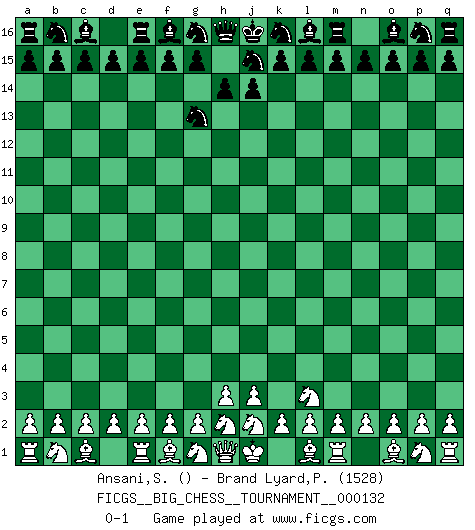 Last move : 0-1 2025 March 4 23:56:48 [Event "FICGS__BIG_CHESS__TOURNAMENT__000132"] [Site "FICGS"] [Date "2025.02.01"] [Round "1"] [White "Ansani,Salvatore"] [Black "Brand Lyard,Paul"] [Result "0-1"] [WhiteElo ""] [BlackElo "1528"] 1.k1-l3 h15-g13 0-1 This big chess game has been lost on time (started : 2025.02.01 10:29:37) Follow this game move after move (download)Fischer wanted to give the Russians a taste of their own medicine. (Larry Evans) Ich verachte die Medien. (Robert James Fischer) Existen dos clases de sacrificios: los correctos y los míos. (Mikhail Tal) L'attaque fait le spectacle, la défense gagne les matchs. (Dicton footballistique) Gambling : The sure way of getting nothing from something. (Wilson Mizner)