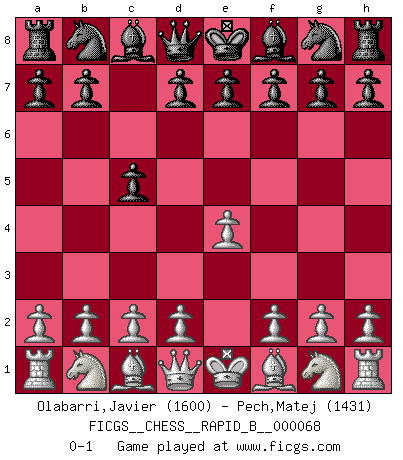 Last move : 0-1 2007 November 21 19:31:16 [Event "FICGS__CHESS__RAPID_B__000068"] [Site "FICGS"] [Date "2007.09.26"] [Round "1"] [White "Olabarri,Javier"] [Black "Pech,Matej"] [Result "0-1"] [WhiteElo "1600"] [BlackElo "1431"] 1.e4 c5 0-1 This chess game has been lost on time (started : 2007.09.26 13:34:21) Sicilian defense Player Black won this chess game. Follow this game move after move (download)Openings teach you openings. Endgames teach you chess ! (Stephan Gerzadowicz) Es ist besser die Steine des Gegners zu opfern. (Savielly Grigorievitsch Tartakower) La vida es como el Ajedrez, con lucha, competición y eventos buenos y malos. (Benjamin Franklin) Fischer est le meilleur joueur du monde et Karpov n'est qu'un joueur de bistrot. (Garry Kasparov, agé de 16 ans) There will be no order, only chaos. (Sol Robeson in Pi by Darren Aronofsky)