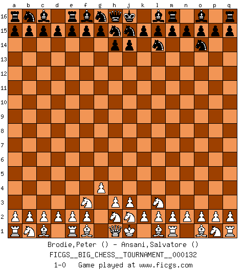 Last move : 1-0 2025 March 8 11:56:52 [Event "FICGS__BIG_CHESS__TOURNAMENT__000132"] [Site "FICGS"] [Date "2025.02.01"] [Round "1"] [White "Brodie,Peter"] [Black "Ansani,Salvatore"] [Result "1-0"] [WhiteElo ""] [BlackElo ""] 1.k1-l3 p16-o14 2.g1-f3 k16-l14 3.g2-g4 1-0 This big chess game has been lost on time (started : 2025.02.01 10:29:37) Follow this game move after move (download)A thorough understanding of the typical mating continuations makes the most complicated sacrificial combinations leading up to them not only not difficult, but almost a matter of course. (Siegbert Tarrasch) Fallen sollten polizeilich verboten werden. (Savielly Grigorievitsch Tartakower) Las Aperturas te enseñan aperturas. ¡Los Finales te enseñan Ajedrez!. (Stephan Gerzadowicz) Celui qui prend des risques peut perdre, celui qui n'en prend pas perd toujours. (Xavier Tartacover) Programmer - an organism that turns coffee into software. (Anonymous)