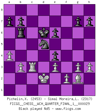 Last move : 1/2-1/2 2025 May 22 0:2:26 [Event "FICGS__CHESS__WCH_QUARTER_FINAL_1__000029"] [Site "FICGS"] [Date "2025.02.02"] [Round "7"] [White "Pichelin,Xavier"] [Black "Simal Moreira,Leonardo"] [Result "1/2-1/2"] [WhiteElo "2453"] [BlackElo "2317"] 1.d4 Nf6 2.c4 e6 3.g3 d5 4.Bg2 Bb4+ 5.Nd2 O-O 6.Ngf3 dxc4 7.Qc2 c5 8.dxc5 Nc6 9.O-O e5 10.Qxc4 Be6 11.Qc2 Qe7 12.Nb3 Bxb3 13.Qxb3 e4 14.Nh4 Bxc5 15.Nf5 Qe6 16.Qxe6 fxe6 17.Be3 Bxe3 18.Nxe3 Nd4 19.Rfd1 Rad8 20.Kf1 Nf5 21.Nc4 Kf7 22.e3 Rxd1+ 23.Rxd1 Rc8 24.Nd2 Nd6 25.Ke1 Ke7 26.h3 Rc2 27.Rb1 Nc4 28.Nxc4 Rxc4 29.Kd2 Rb4 30.b3 Rb6 31.Rc1 Rd6+ 32.Ke1 Ra6 33.a4 Rb6 34.Rc3 Kd6 35.Kd2 Nd5 36.Rc8 Rxb3 37.Bxe4 Rb2+ 38.Ke1 Nf6 39.Bf3 Nd7 40.Ra8 Nc5 41.Kf1 a6 42.Rd8+ Ke5 43.Rg8 g6 44.Rg7 b5 45.axb5 axb5 46.Rxh7 Nd3 47.Be2 Rb1+ 48.Kg2 Ne1+ 49.Kf1 Nd3 50.Kg2 Ne1+ 51.Kf1 Nd3 1/2-1/2 Follow this game move after move (download)Good positions don't win games, good moves do. (Gerald Abrahams) Alle offensichtlichen Züge sehen nach dem Spiel in der Analyse verdächtig aus. (Viktor Kortschnoi) Los libros de Ajedrez deben de usarse igual como usamos los anteojos: para mejorar la vista, aunque algunos jugadores los quieren usar como si ellos les otorgaran la vision. (José Raúl Capablanca) A ce moment-là, je menaçais de comprendre la position ! (Clément L'Heureux) Programming can only do so much before it becomes too much. (Don Groves)