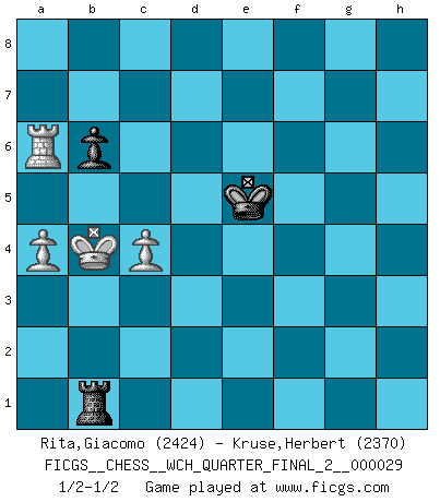Last move : 1/2-1/2 2025 May 7 2:50:19 [Event "FICGS__CHESS__WCH_QUARTER_FINAL_2__000029"] [Site "FICGS"] [Date "2025.02.02"] [Round "5"] [White "Rita,Giacomo"] [Black "Kruse,Herbert"] [Result "1/2-1/2"] [WhiteElo "2424"] [BlackElo "2370"] 1.e4 e6 2.d4 d5 3.Nc3 Nf6 4.Bg5 dxe4 5.Nxe4 Nbd7 6.Nf3 h6 7.Nxf6+ Nxf6 8.Be3 Bd6 9.Bd3 O-O 10.Qe2 b6 11.O-O-O Bb7 12.Rhg1 Nd5 13.Bd2 Nf4 14.Bxf4 Bxf4+ 15.Kb1 Qf6 16.Ne5 Bxe5 17.dxe5 Qh4 18.h3 Rad8 19.Qe3 c5 20.g4 Rd4 21.c3 Rd5 22.Bc2 Rxd1+ 23.Rxd1 Bg2 24.f3 Qxh3 25.Be4 Bf1 26.Qf2 Bc4 27.b3 Bd5 28.Bxd5 exd5 29.Rxd5 Re8 30.Kb2 g6 31.Ka3 Kg7 32.c4 Re6 33.Rd7 a6 34.Rd5 h5 35.gxh5 Qxh5 36.f4 Qh1 37.Qd2 Qb1 38.Ka4 Qe4 39.Rd6 Qf5 40.Rd5 Qe4 41.Rd6 Qf5 42.Rd7 g5 43.fxg5 Qxe5 44.Ka3 Re7 45.Rd6 Re6 46.Rd7 Re7 47.Rd5 Qe1 48.Qb2+ Kg8 49.Qd2 Qxd2 50.Rxd2 Kg7 51.Rd6 Re6 52.Rd7 Kg6 53.Rb7 Rd6 54.b4 f5 55.gxf6 cxb4+ 56.Kxb4 Kxf6 57.a4 Ke5 58.Ra7 Rd1 59.Rxa6 Rb1+ 60.Kc3 Rc1+ 61.Kb4 Rb1+ 62.Kc3 Rc1+ 63.Kb4 Rb1+ 1/2-1/2 Follow this game move after move (download)Bobby is the most misunderstood, misquoted celebrity walking the face of this earth. (Yasser Seirawan) Fischer: 'Remis!?' Uhlmann: 'Aber es muss doch dreimal Zugwiederholung sein!' Fischer: 'Sie nehmen das Remis an, wie ich es sage, sonst spiele ich weiter und werde Sie dann schlagen!' (Robert James Fischer) Jugadores de primera clase pierden en contra de jugadores de segunda clase porque los jugadores de segunda clase a veces juegan una partida de primer clase. (Siegbert Tarrasch) Les réformistes prétendent que les progrès de la théorie conduiront à la disparition des échecs, et qu'il faut, pour leur rendre vie, en remanier les règles. En réalité, qu'exprime cette affirmation? Le mépris de l'intuition, de l'imagination et de tous les autres éléments qui font des échecs un art. (Alexander Alekhine) Real knowledge is to know the extent of one's ignorance. (Confucius)